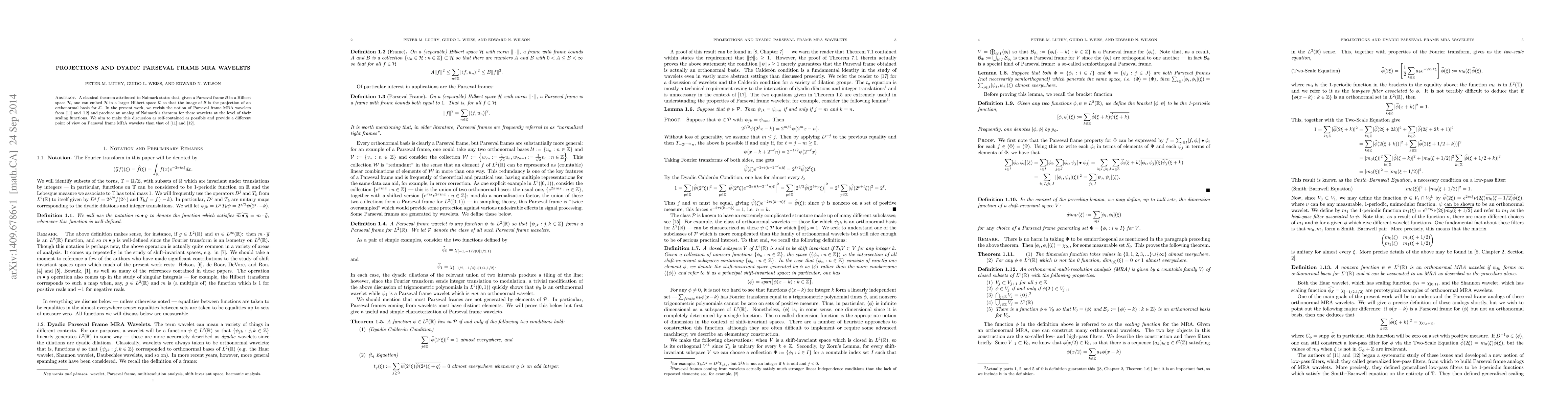 A classical theorem attributed to Naimark states that, given a Parseval frame $\mathcal{B}$ in a Hilbert space $\mathcal{H}$, one can embed $\mathcal{H}$ in a larger Hilbert space $\mathcal{K}$ so that the image of $\mathcal{B}$ is the projection of an orthonormal basis for $\mathcal{K}$. In the present work, we revisit the notion of Parseval frame MRA wavelets from two papers of Paluszy\'nski, \v{S}iki\'c, Weiss, and Xiao (PSWX) and produce an analog of Naimark's theorem for these wavelets at the level of their scaling functions. We aim to make this discussion as self-contained as possible and provide a different point of view on Parseval frame MRA wavelets than that of PSWX.