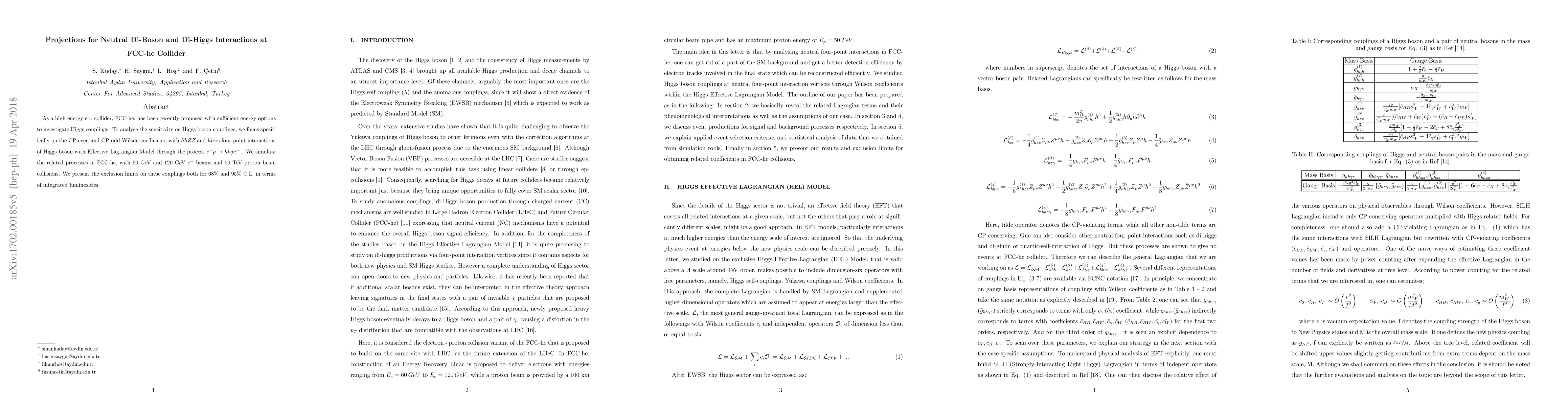 This paper investigates the sensitivity of the FCC-he collider to CP-even and CP-odd Wilson coefficients in Higgs boson interactions via $hhZZ$ and $hh\gamma\gamma$ processes using an Effective Lagrangian Model. It presents exclusion limits for these couplings at 68% and 95% confidence levels under different integrated luminosities for 60 GeV and 120 GeV electron beams and a 50 TeV proton beam.
