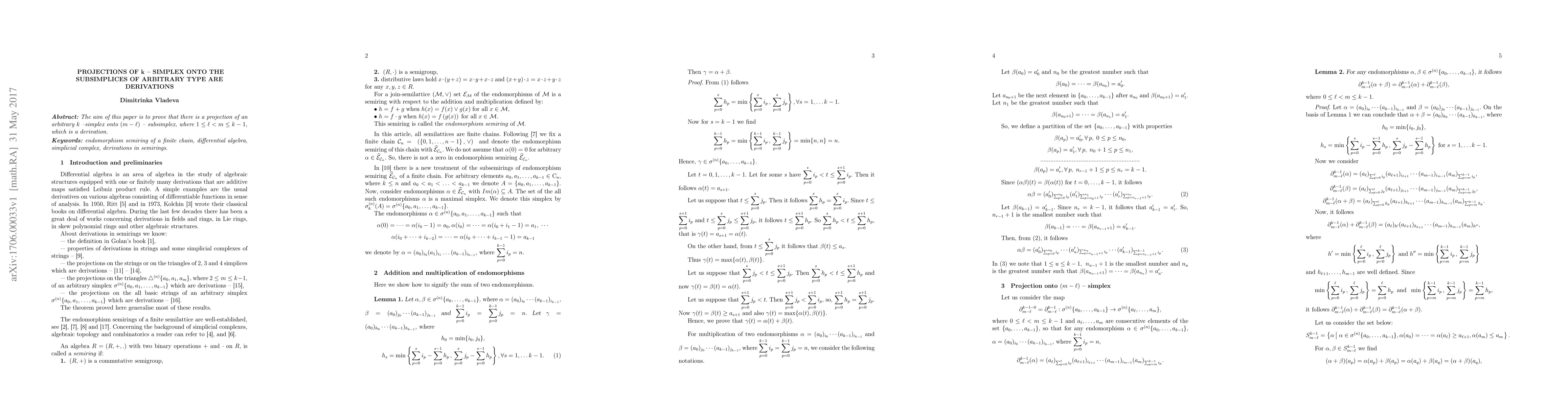 A paper proves the existence of a projection from an arbitrary k-simplex onto an (m - l)-subsimplex that is a derivation, with implications for mathematical derivations and geometric projections.