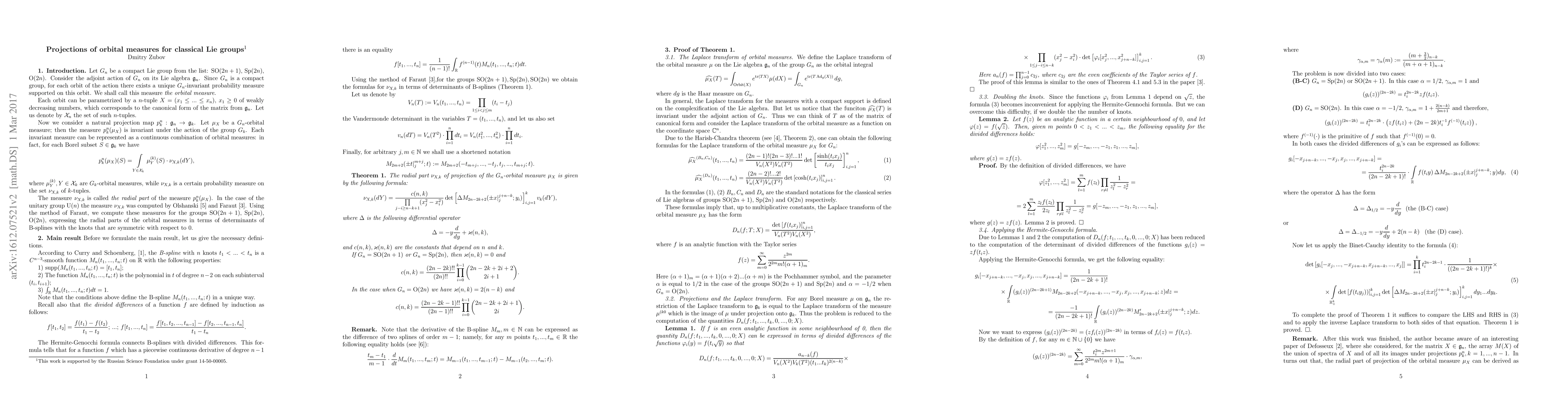 This paper computes radial parts of projections for orbital measures in classical Lie groups $SO(2n+1)$, $Sp(2n)$, and $O(2n)$, extending previous results from the unitary group by Olshanski and Faraut, expressing the findings in terms of symmetric B-spline determinant representations.