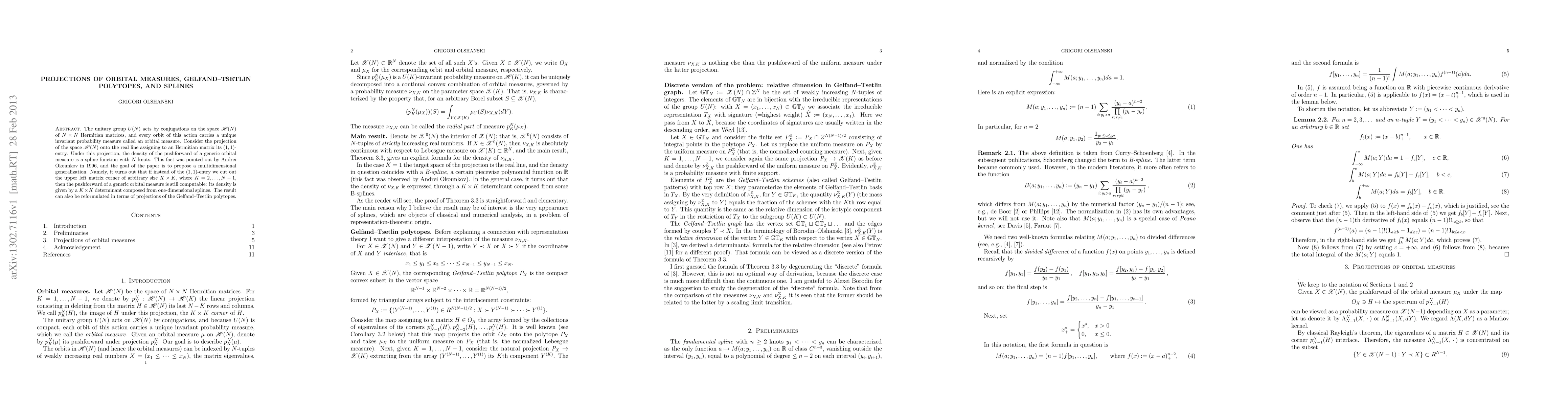The unitary group U(N) acts by conjugations on the space H(N) of NxN Hermitian matrices, and every orbit of this action carries a unique invariant probability measure called an orbital measure. Consider the projection of the space H(N) onto the real line assigning to an Hermitian matrix its (1,1)-entry. Under this projection, the density of the pushforward of a generic orbital measure is a spline function with N knots. This fact was pointed out by Andrei Okounkov in 1996, and the goal of the paper is to propose a multidimensional generalization. Namely, it turns out that if instead of the (1,1)-entry we cut out the upper left matrix corner of arbitrary size KxK, where K=2,...,N-1, then the pushforward of a generic orbital measure is still computable: its density is given by a KxK determinant composed from one-dimensional splines. The result can also be reformulated in terms of projections of the Gelfand-Tsetlin polytopes.
