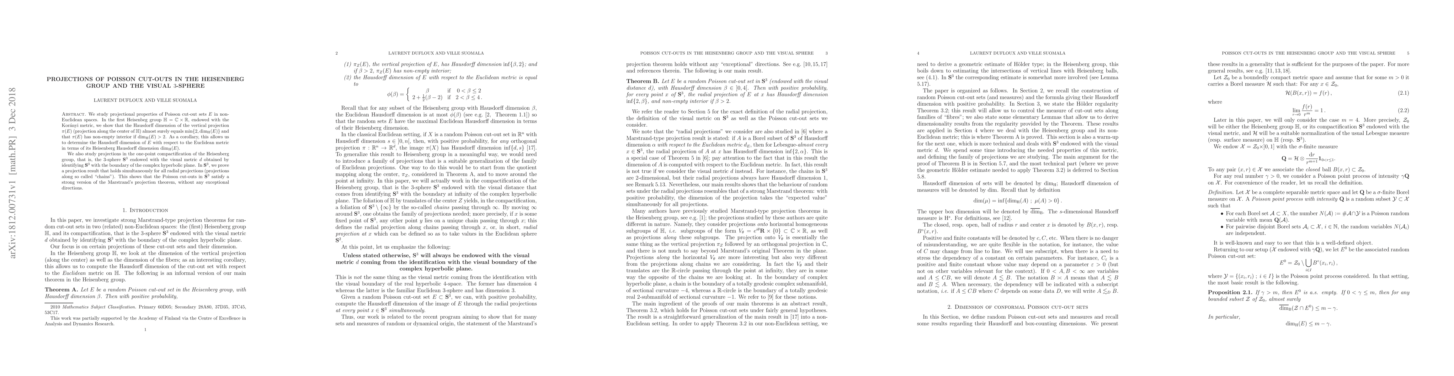 We study projectional properties of Poisson cut-out sets $E$ in non-Euclidean spaces. In the first Heisenbeg group, endowed with the Kor\'anyi metric, we show that the Hausdorff dimension of the vertical projection $\pi(E)$ (projection along the center of the Heisenberg group) almost surely equals $\min\{2,dim_H(E)\}$ and that $\pi(E)$ has non-empty interior if $dim_H(E)>2$. As a corollary, this allows us to determine the Hausdorff dimension of $E$ with respect to the Euclidean metric in terms of its Heisenberg Hausdorff dimension $dim_H (E)$. We also study projections in the one-point compactification of the Heisenberg group, that is, the $3$-sphere $S^3$ endowed with the visual metric $d$ obtained by identifying $S^3$ with the boundary of the complex hyperbolic plane. In $S^3$, we prove a projection result that holds simultaneously for all radial projections (projections along so called "chains"). This shows that the Poisson cut-outs in $S^3$ satisfy a strong version of the Marstrand's projection theorem, without any exceptional directions.
