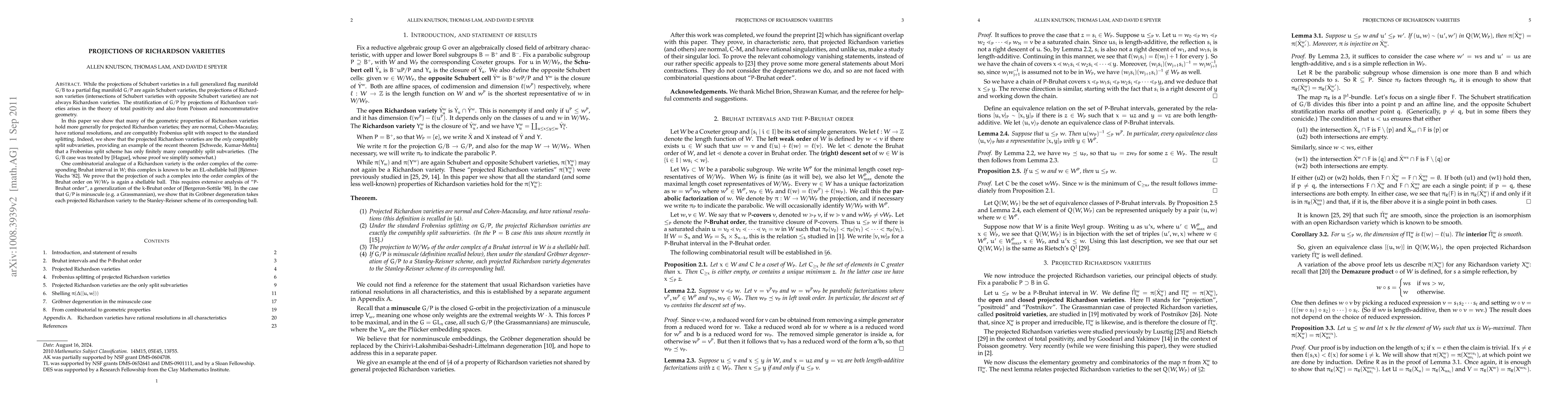 While the projections of Schubert varieties in a full generalized flag manifold G/B to a partial flag manifold $G/P$ are again Schubert varieties, the projections of Richardson varieties (intersections of Schubert varieties with opposite Schubert varieties) are not always Richardson varieties. The stratification of G/P by projections of Richardson varieties arises in the theory of total positivity and also from Poisson and noncommutative geometry. In this paper we show that many of the geometric properties of Richardson varieties hold more generally for projected Richardson varieties; they are normal, Cohen-Macaulay, have rational singularities, and are compatibly Frobenius split with respect to the standard splitting. Indeed, we show that the projected Richardson varieties are the only compatibly split subvarieties, providing an example of the recent theorem [Schwede, Kumar-Mehta] that a Frobenius split scheme has only finitely many compatibly split subvarieties. (The G/B case was treated by [Hague], whose proof we simplify somewhat.) One combinatorial analogue of a Richardson variety is the order complex of the corresponding Bruhat interval in W; this complex is known to be an EL-shellable ball [Bjorner-Wachs '82]. We prove that the projection of such a complex into the order complex of the Bruhat order on W/W_P is again a shellable ball. This requires extensive analysis of "P-Bruhat order", a generalization of the k-Bruhat order of [Bergeron-Sottile '98]. In the case that G/P is minuscule (e.g. a Grassmannian), we show that its Grobner degeneration takes each projected Richardson variety to the Stanley-Reisner scheme of its corresponding ball.