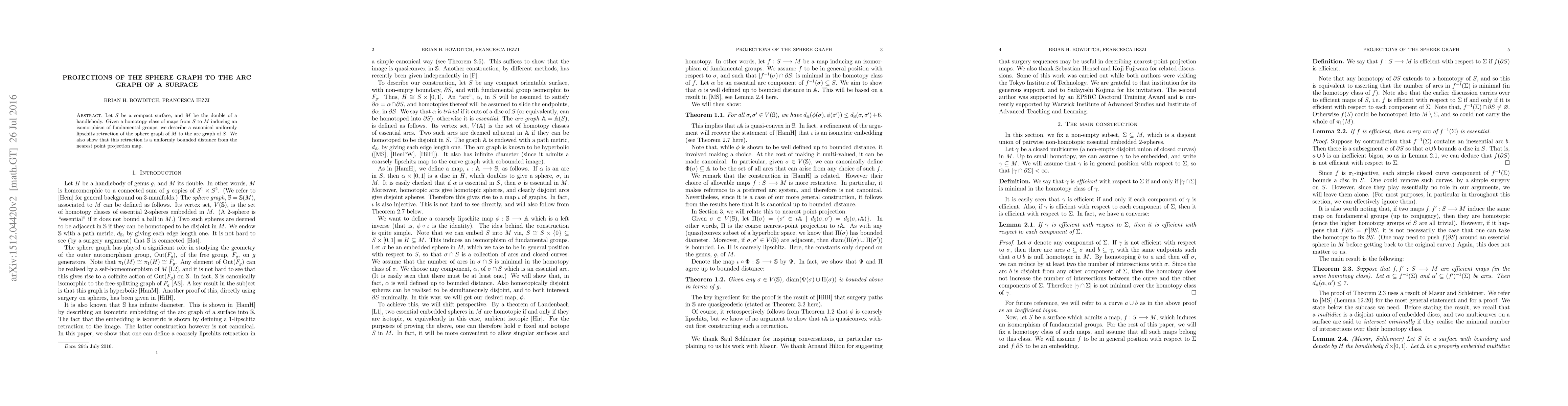 A research paper describes a method to project the sphere graph of a surface's double (a handlebody) onto its arc graph, creating a uniformly Lipschitz retraction that is bounded by distance from the nearest point projection map.