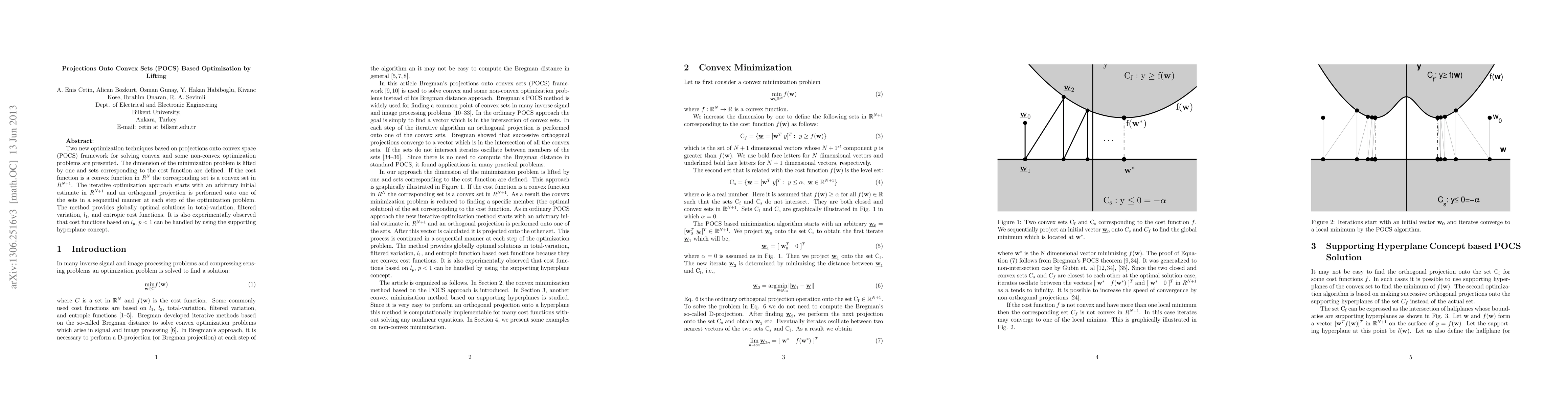 Two new optimization techniques based on projections onto convex space (POCS) framework for solving convex and some non-convex optimization problems are presented. The dimension of the minimization problem is lifted by one and sets corresponding to the cost function are defined. If the cost function is a convex function in R^N the corresponding set is a convex set in R^(N+1). The iterative optimization approach starts with an arbitrary initial estimate in R^(N+1) and an orthogonal projection is performed onto one of the sets in a sequential manner at each step of the optimization problem. The method provides globally optimal solutions in total-variation, filtered variation, l1, and entropic cost functions. It is also experimentally observed that cost functions based on lp, p<1 can be handled by using the supporting hyperplane concept.