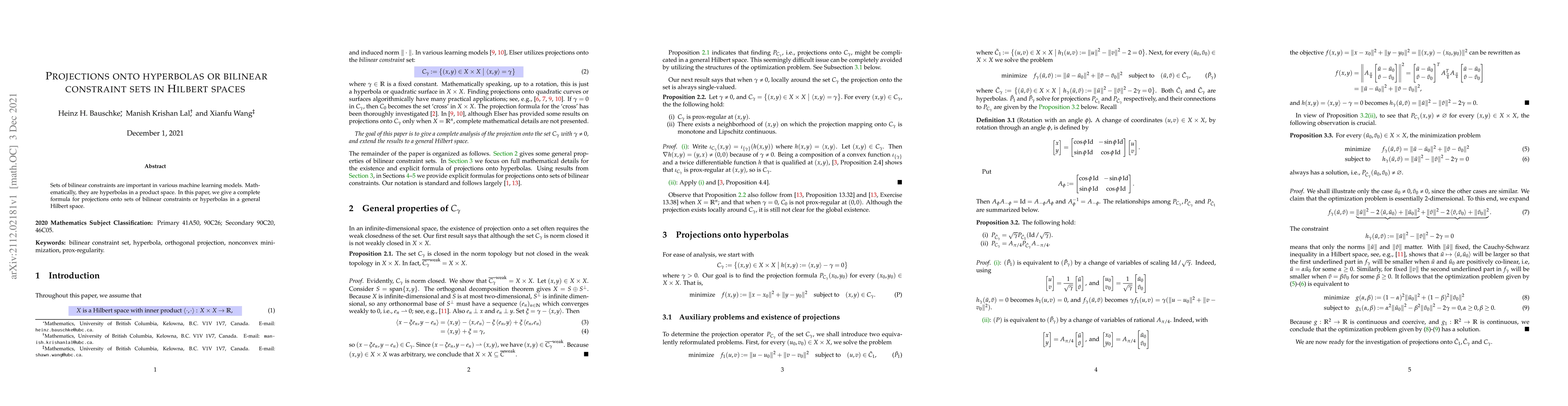 This paper provides a comprehensive formula for projecting onto sets of bilinear constraints, which are mathematically represented as hyperbolas in a product space, within the context of general Hilbert spaces. The findings are significant for machine learning models that utilize such constraints.