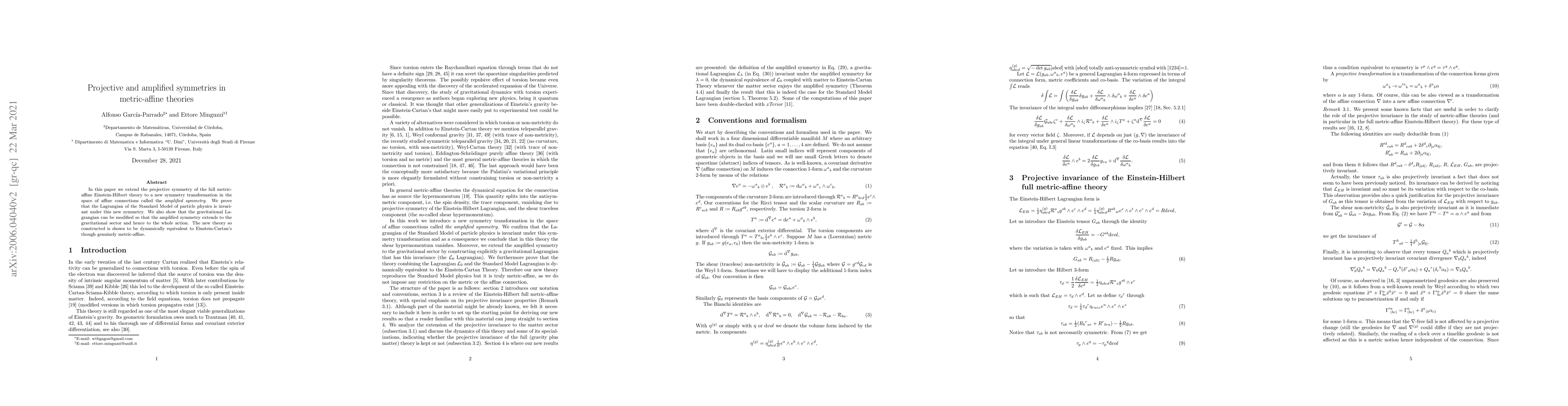 This paper introduces an amplified symmetry transformation in metric-affine theories, extending the projective symmetry of the full metric-affine Einstein-Hilbert theory. It demonstrates that the Standard Model Lagrangian remains invariant under this new symmetry, and proposes a modified gravitational Lagrangian that incorporates this amplified symmetry, resulting in a dynamically equivalent theory to Einstein-Cartan's but distinctly metric-affine.