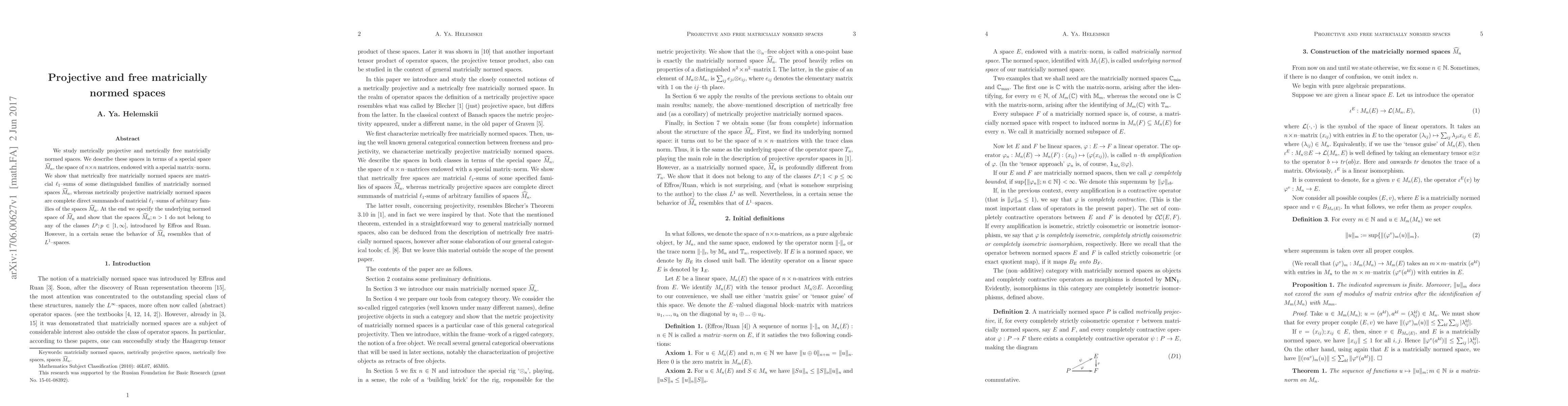 This paper explores metrically projective and free matricially normed spaces, demonstrating that metrically free spaces are matricial $\ell_1$-sums of specific matrix spaces $\widehat M_n$ while metrically projective spaces are complete direct summands of such sums. The paper concludes by noting that $\widehat M_n$ does not fit into $L^p$ classes but exhibits behavior akin to $L^1$-spaces.