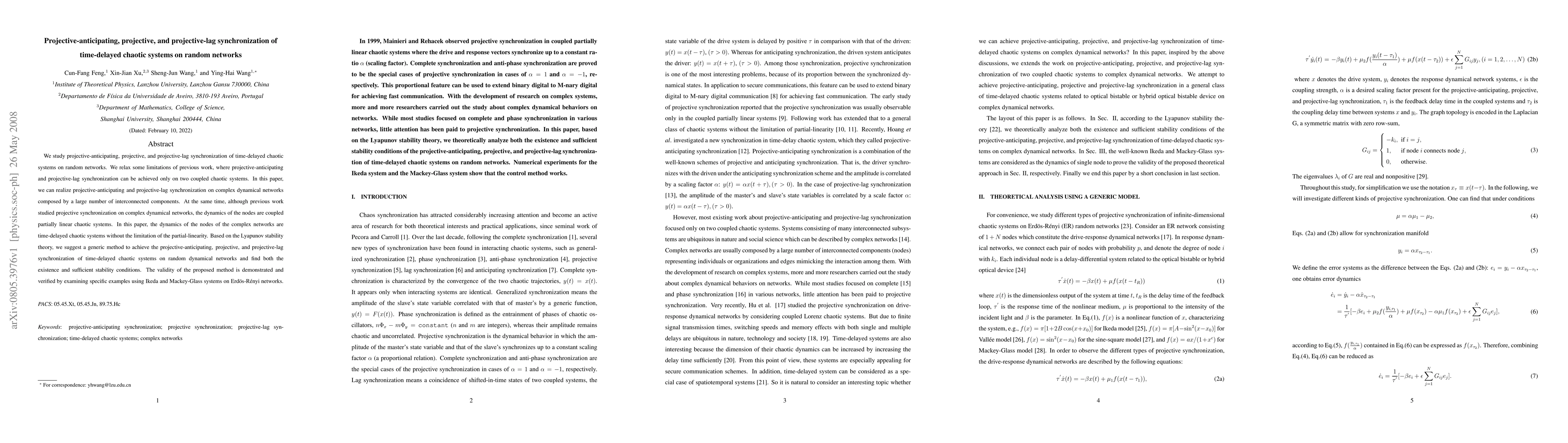 This paper explores projective-anticipating, projective, and projective-lag synchronization of time-delayed chaotic systems on random networks, extending previous work to larger, complex dynamical networks. It proposes a method based on Lyapunov stability theory to achieve synchronization without the partial-linearity limitation, validated through examples using Ikeda and Mackey-Glass systems on Erdos-Renyi networks.