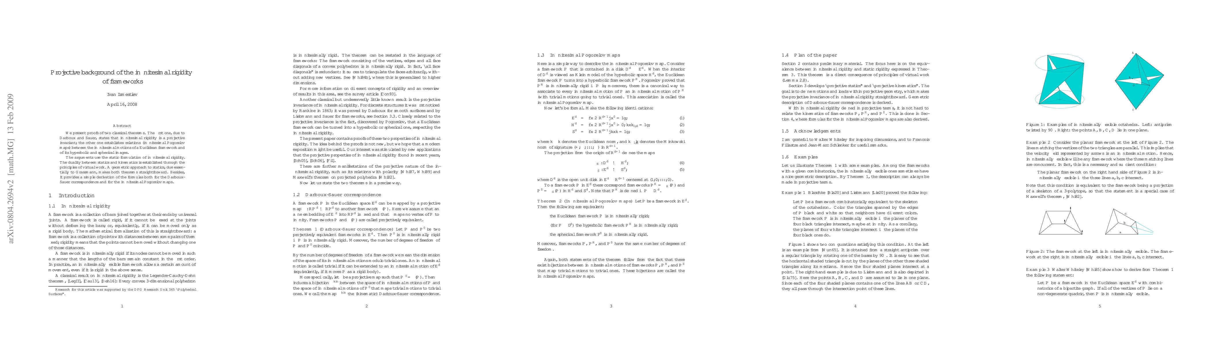 We present proofs of two classical theorems. The first one, due to Darboux and Sauer, states that infinitesimal rigidity is a projective invariant; the other one establishes relations (infinitesimal Pogorelov maps) between the infinitesimal motions of a Euclidean framework and of its hyperbolic and spherical images. The arguments use the static formulation of infinitesimal rigidity. The duality between statics and kinematics is established through the principles of virtual work. A geometric approach to statics, due essentially to Grassmann, makes both theorems straightforward. Besides, it provides a simple derivation of the formulas both for the Darboux-Sauer correspondence and for the infinitesimal Pogorelov maps.