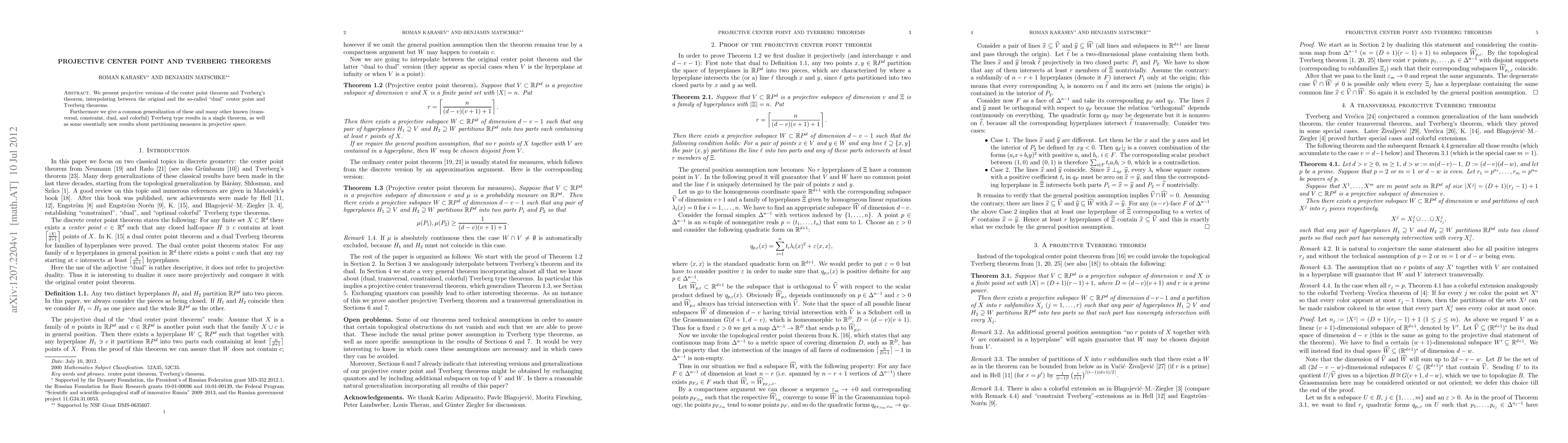 This paper introduces projective versions of the center point theorem and Tverberg's theorem, offering a unified generalization of various known Tverberg type results, alongside new insights into partitioning measures in projective space.
