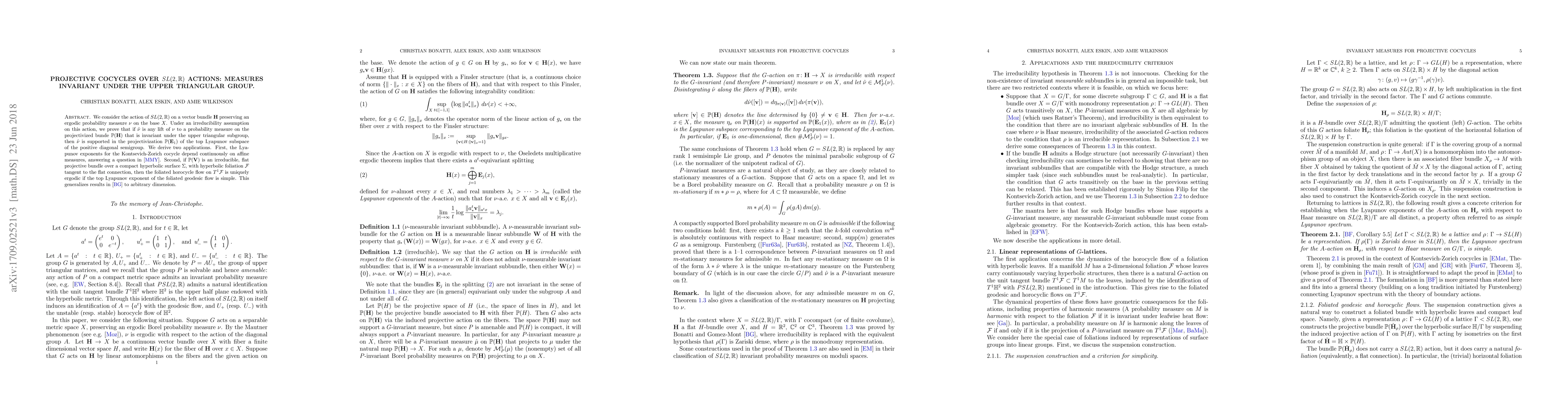 We consider the action of $SL(2,\mathbb{R})$ on a vector bundle $\mathbf{H}$ preserving an ergodic probability measure $\nu$ on the base $X$. Under an irreducibility assumption on this action, we prove that if $\hat\nu$ is any lift of $\nu$ to a probability measure on the projectivized bunde $\mathbb{P}(\mathbf{H})$ that is invariant under the upper triangular subgroup, then $\hat \nu$ is supported in the projectivization $\mathbb{P}(\mathbf{E}_1)$ of the top Lyapunov subspace of the positive diagonal semigroup. We derive two applications. First, the Lyapunov exponents for the Kontsevich-Zorich cocycle depend continuously on affine measures, answering a question in [MMY]. Second, if $\mathbb{P}(\mathbf{V})$ is an irreducible, flat projective bundle over a compact hyperbolic surface $\Sigma$, with hyperbolic foliation $\mathcal{F}$ tangent to the flat connection, then the foliated horocycle flow on $T^1\mathcal{F}$ is uniquely ergodic if the top Lyapunov exponent of the foliated geodesic flow is simple. This generalizes results in [BG] to arbitrary dimension.