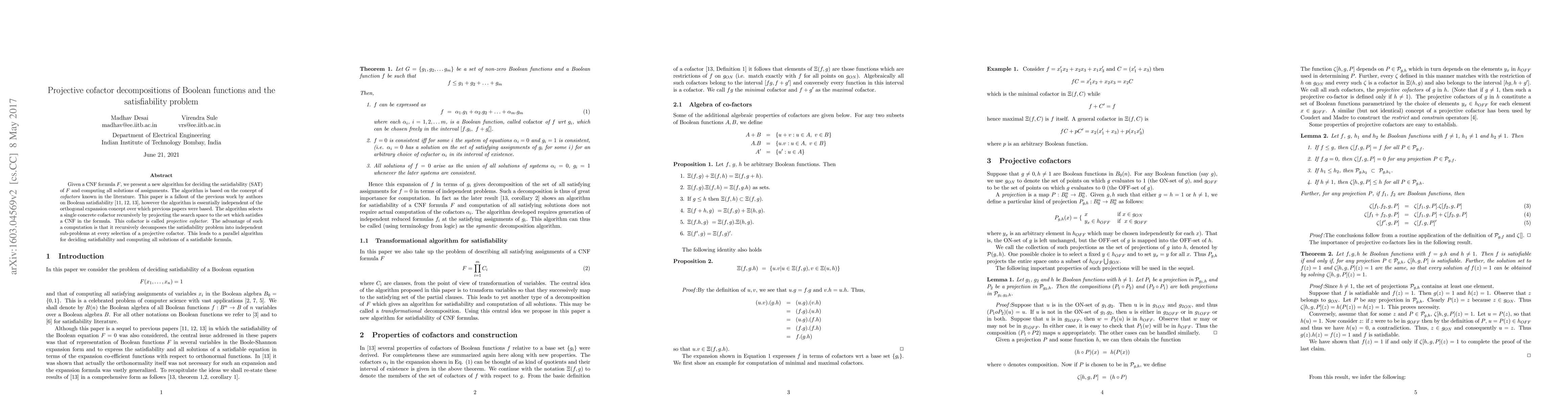 Given a CNF formula $F$, we present a new algorithm for deciding the satisfiability (SAT) of $F$ and computing all solutions of assignments. The algorithm is based on the concept of \emph{cofactors} known in the literature. This paper is a fallout of the previous work by authors on Boolean satisfiability \cite{sul1, sul2,sude}, however the algorithm is essentially independent of the orthogonal expansion concept over which previous papers were based. The algorithm selects a single concrete cofactor recursively by projecting the search space to the set which satisfies a CNF in the formula. This cofactor is called \emph{projective cofactor}. The advantage of such a computation is that it recursively decomposes the satisfiability problem into independent sub-problems at every selection of a projective cofactor. This leads to a parallel algorithm for deciding satisfiability and computing all solutions of a satisfiable formula.