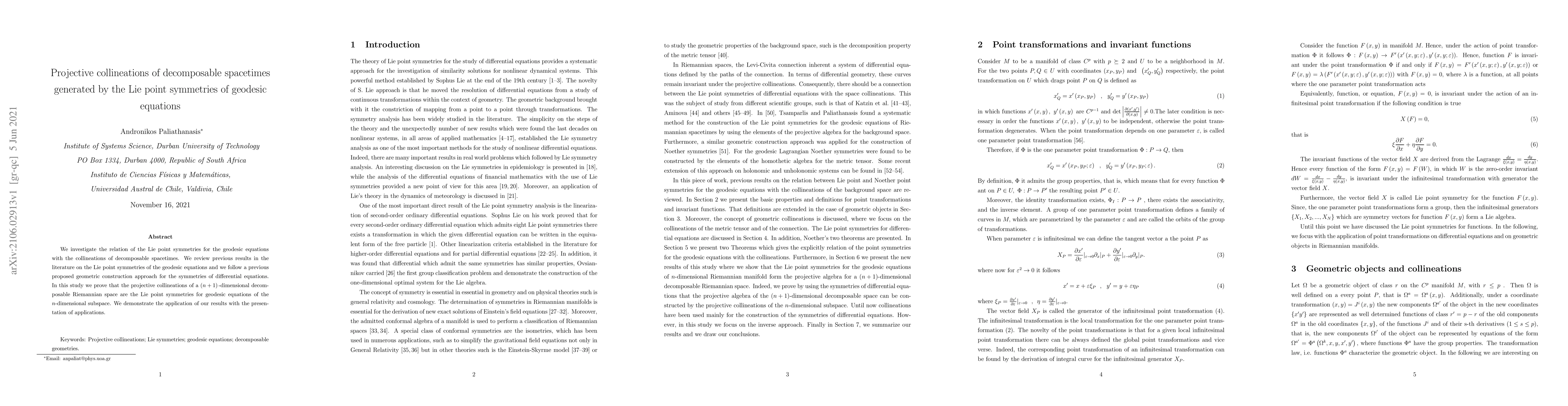This paper explores the connection between Lie point symmetries of geodesic equations and projective collineations in decomposable spacetimes. It shows that projective collineations in $(n+1)$-dimensional decomposable Riemannian spaces correspond to Lie point symmetries of the $n$-dimensional subspace's geodesic equations, demonstrating this with specific applications.