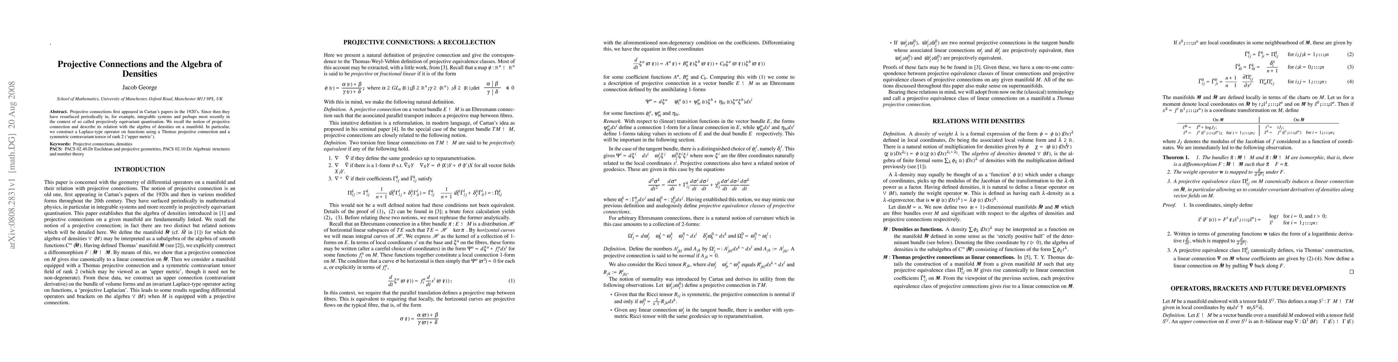 Projective connections first appeared in Cartan's papers in the 1920's. Since then they have resurfaced periodically in, for example, integrable systems and perhaps most recently in the context of so called projectively equivariant quantisation. We recall the notion of projective connection and describe its relation with the algebra of densities on a manifold. In particular, we construct a Laplace-type operator on functions using a Thomas projective connection and a symmetric contravariant tensor of rank 2 (`upper metric').