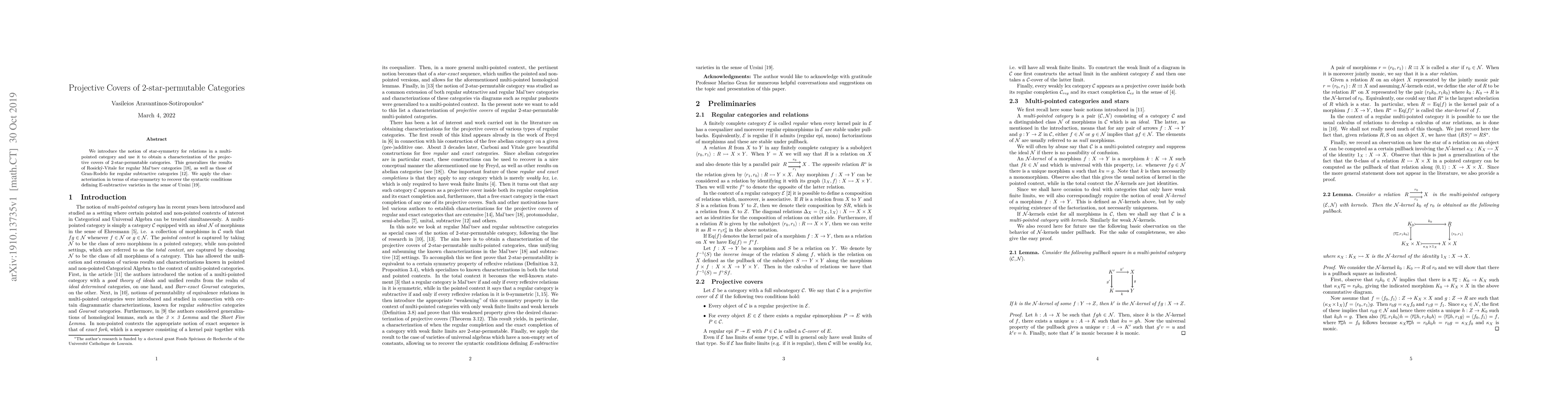 This paper introduces star-symmetry for relations in multi-pointed categories to characterize projective covers of 2-star-permutable categories, generalizing prior results for regular Mal'tsev and subtractive categories. It also applies this characterization to define E-subtractive varieties.