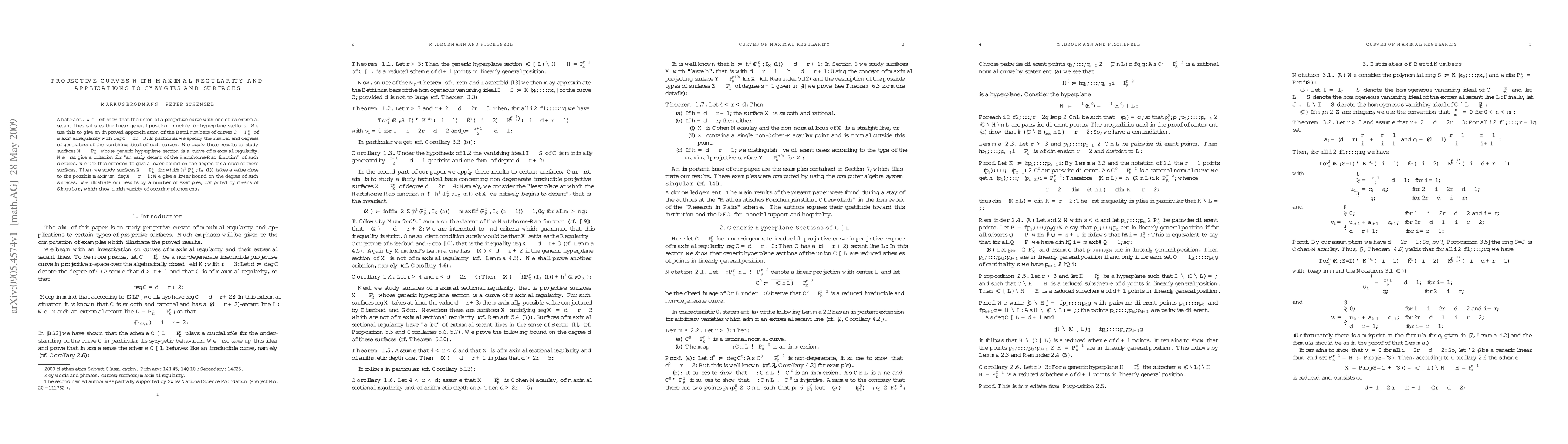 This paper investigates projective curves of maximal regularity and their syzygies, proving that the union of such curves with their extremal secant lines satisfies the linear general position principle. It provides an improved approximation of Betti numbers and the number of generators for the vanishing ideal of these curves, and applies these results to study surfaces whose generic hyperplane sections are of maximal regularity, giving criteria and lower bounds on their degrees.