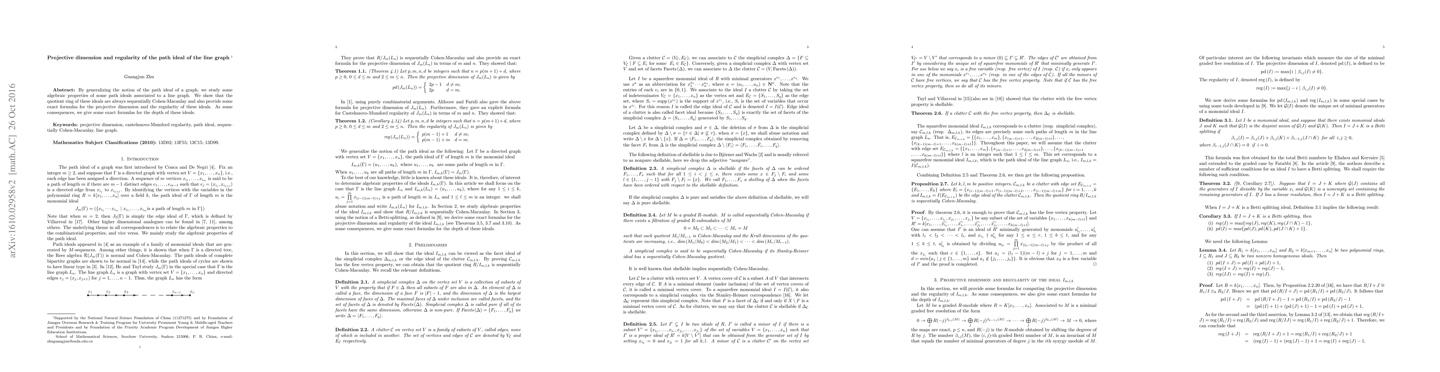 Researchers studied algebraic properties of path ideals associated with line graphs, finding that these ideals have sequential Cohen-Macaulay quotients and provide exact formulas for their projective dimension and regularity.