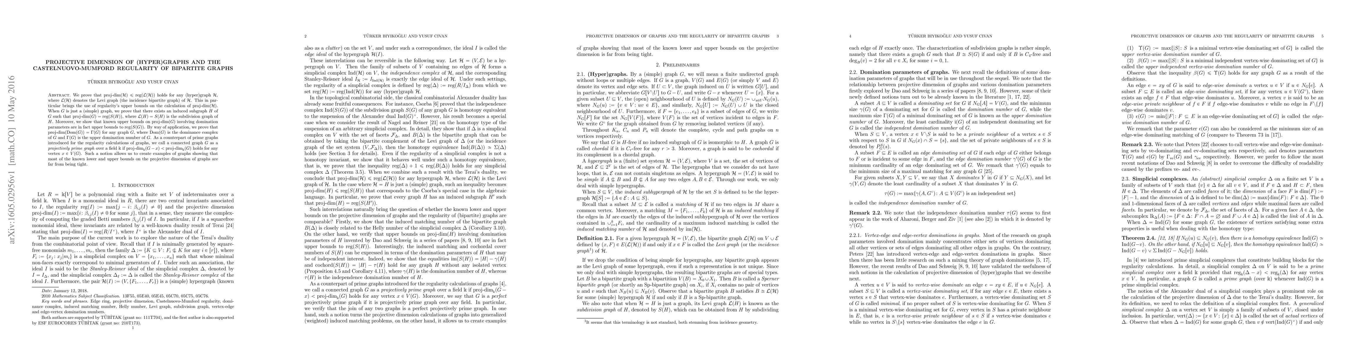 This paper establishes an upper bound for the projective dimension of (hyper)graphs in terms of the Castelnuovo-Mumford regularity of their Levi graphs. It further demonstrates that the projective dimension of a simple graph can be determined by the regularity of its subdivision graph.