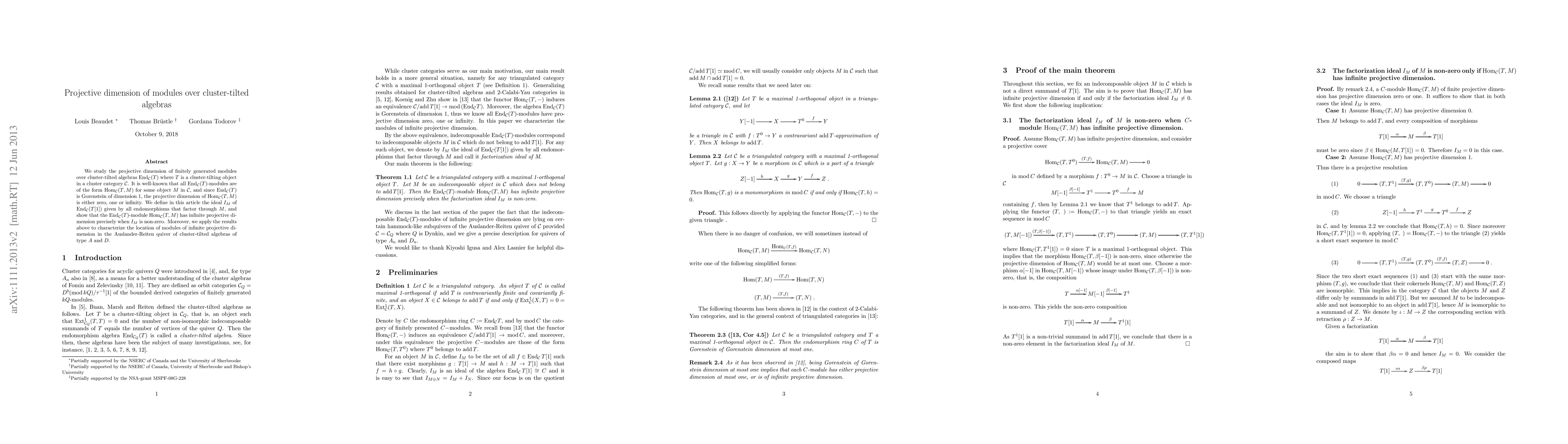 This paper investigates the projective dimension of modules over cluster-tilted algebras, demonstrating that Hom(T,M) has infinite projective dimension when the ideal I_M of End(T[1]) is non-zero. It also characterizes the placement of such modules in the Auslander-Reiten quiver for cluster-tilted algebras of types $A$ and $D$.