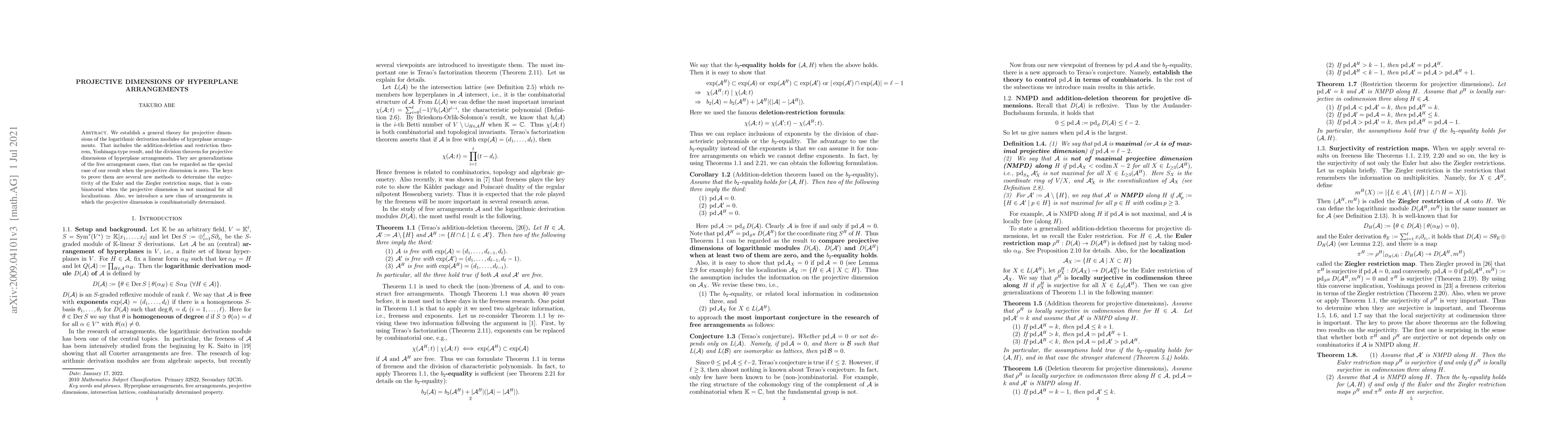 We establish a general theory for projective dimensions of the logarithmic derivation modules of hyperplane arrangements. That includes the addition-deletion and restriction theorem, Yoshinaga-type result, and the division theorem for projective dimensions of hyperplane arrangements. They are generalizations of the free arrangement cases, that can be regarded as the special case of our result when the projective dimension is zero. The keys to prove them are several new methods to determine the surjectivity of the Euler and the Ziegler restriction maps, that is combinatorial when the projective dimension is not maximal for all localizations. Also, we introduce a new class of arrangements in which the projective dimension is comibinatorially determined.