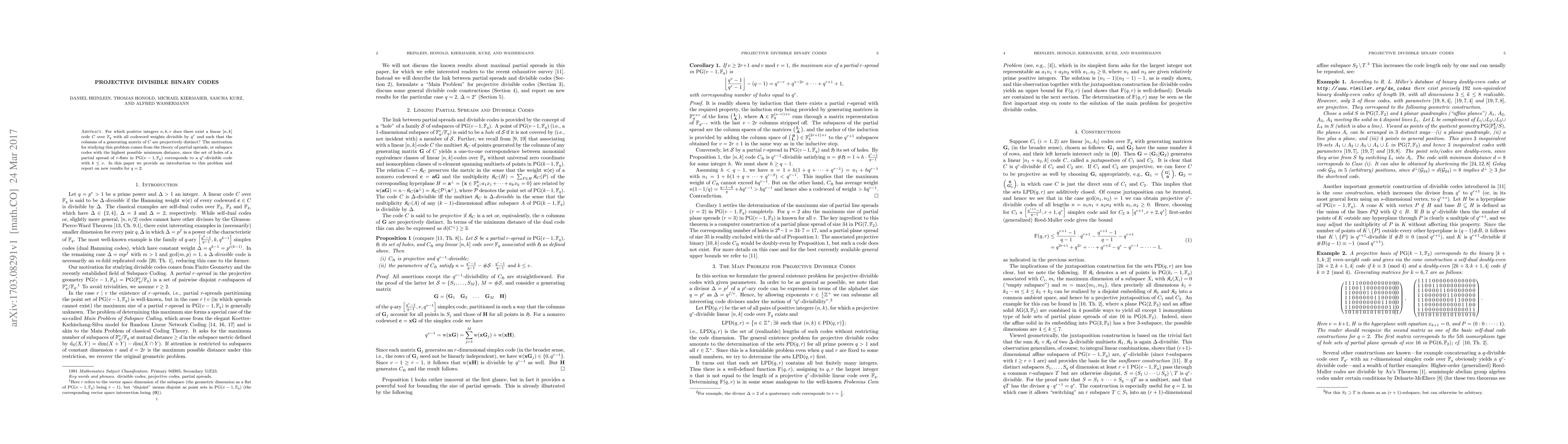 For which positive integers $n,k,r$ does there exist a linear $[n,k]$ code $C$ over $\mathbb{F}_q$ with all codeword weights divisible by $q^r$ and such that the columns of a generating matrix of $C$ are projectively distinct? The motivation for studying this problem comes from the theory of partial spreads, or subspace codes with the highest possible minimum distance, since the set of holes of a partial spread of $r$-flats in $\operatorname{PG}(v-1,\mathbb{F}_q)$ corresponds to a $q^r$-divisible code with $k\leq v$. In this paper we provide an introduction to this problem and report on new results for $q=2$.