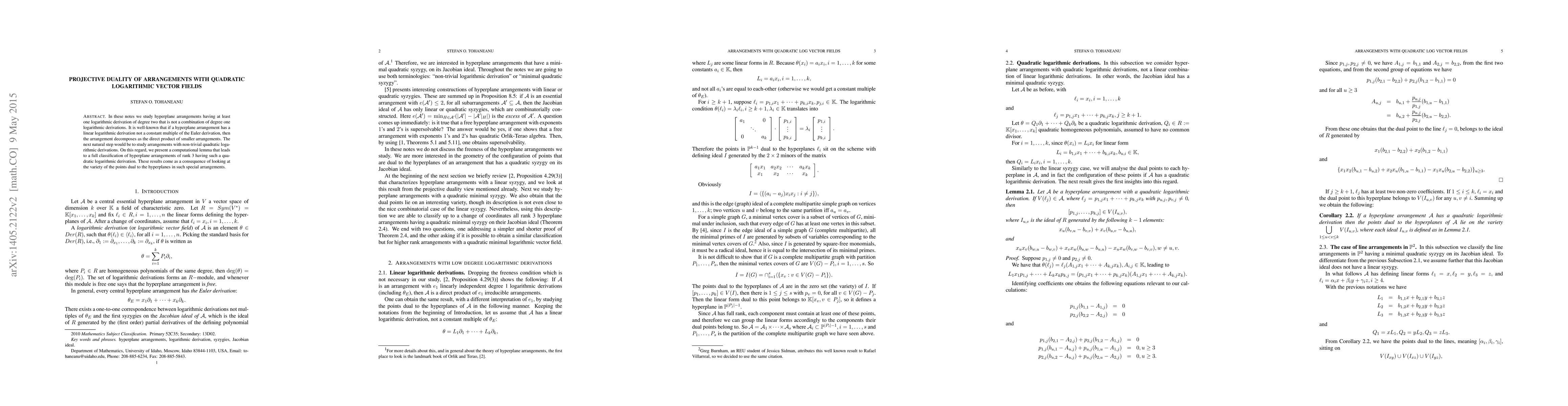 This paper classifies rank 3 hyperplane arrangements with non-trivial quadratic logarithmic derivations, presenting a computational lemma that leverages the projective duality of points to achieve this classification. The study reveals the decomposition properties of such arrangements when they possess a quadratic logarithmic derivation not reducible to lower degrees.