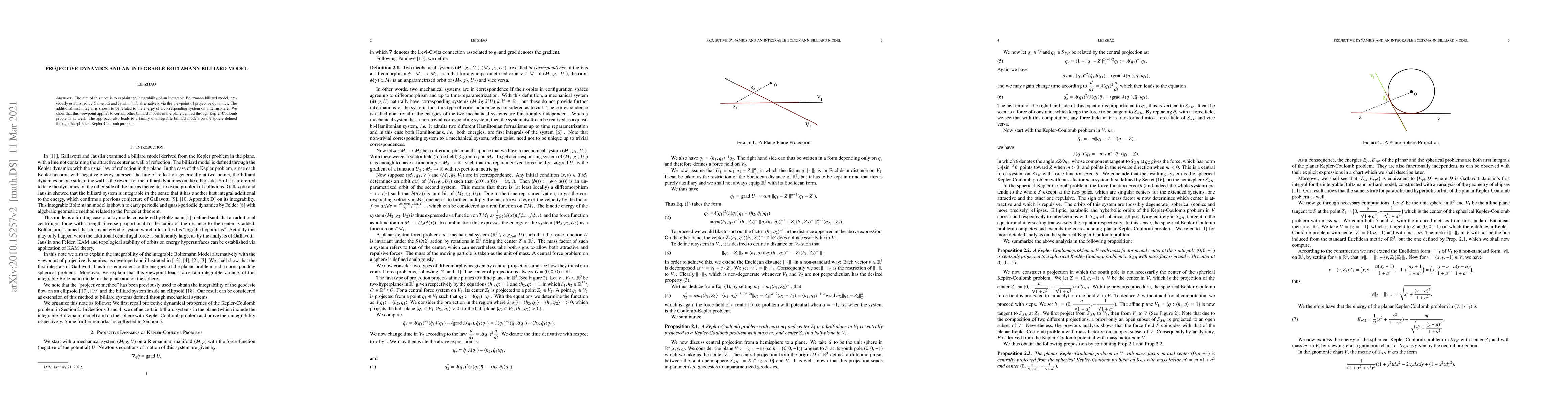 This paper explores the integrability of a Boltzmann billiard model using projective dynamics, revealing an additional first integral linked to the energy of a hemisphere system. It extends this approach to other plane billiard models and introduces integrable models on the sphere based on the spherical Kepler-Coulomb problem.