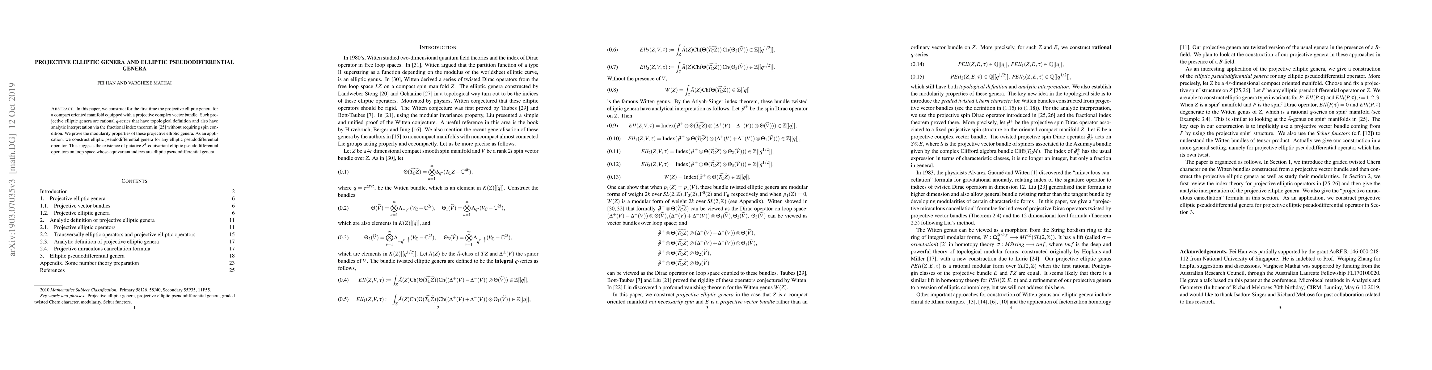 This paper constructs projective elliptic genera for compact oriented manifolds with projective complex vector bundles, proving their modularity properties. It also introduces elliptic pseudodifferential genera for elliptic pseudodifferential operators, suggesting the existence of rotation-equivariant elliptic pseudodifferential operators on loop space.