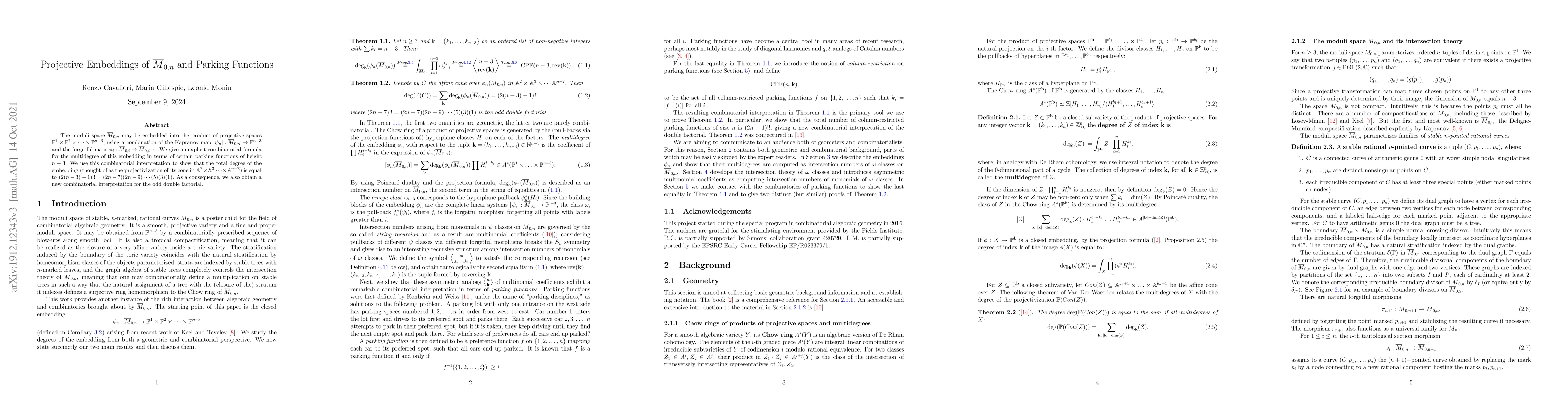 This paper presents an embedding of the moduli space $\overline{M}_{0,n}$ into projective spaces using Kapranov and forgetful maps, and provides a combinatorial formula linking this embedding to parking functions. It concludes with a new interpretation of the odd double factorial through this combinatorial framework.