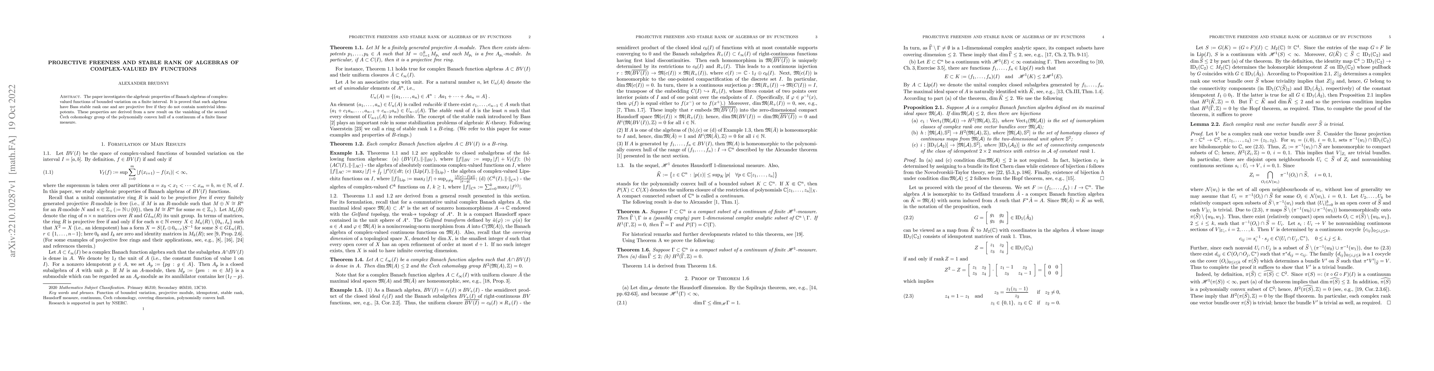 The paper establishes that Banach algebras of complex-valued BV functions on a finite interval have a Bass stable rank of one and are projective free unless they contain nontrivial idempotents, based on a new result about the vanishing of the second \v{C}ech cohomology group of the polynomially convex hull of a finite linear measure continuum.
