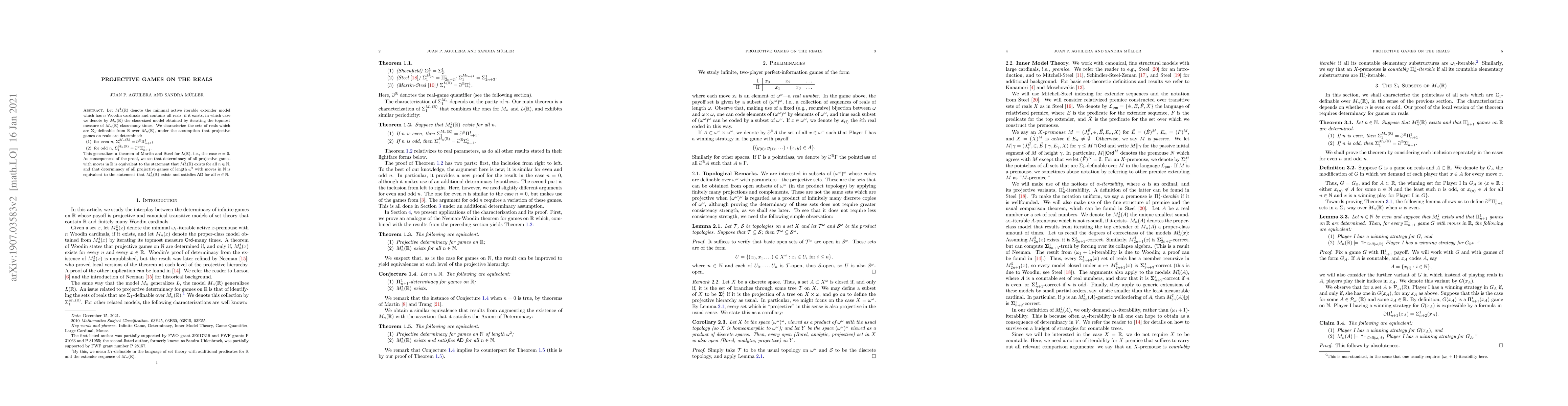 Let $M^\sharp_n(\mathbb{R})$ denote the minimal active iterable extender model which has $n$ Woodin cardinals and contains all reals, if it exists, in which case we denote by $M_n(\mathbb{R})$ the class-sized model obtained by iterating the topmost measure of $M_n(\mathbb{R})$ class-many times. We characterize the sets of reals which are $\Sigma_1$-definable from $\mathbb{R}$ over $M_n(\mathbb{R})$, under the assumption that projective games on reals are determined: (1) for even $n$, $\Sigma_1^{M_n(\mathbb{R})} = \Game^\mathbb{R}\Pi^1_{n+1}$; (2) for odd $n$, $\Sigma_1^{M_n(\mathbb{R})} = \Game^\mathbb{R}\Sigma^1_{n+1}$. This generalizes a theorem of Martin and Steel for $L(\mathbb{R})$, i.e., the case $n=0$. As consequences of the proof, we see that determinacy of all projective games with moves in $\mathbb{R}$ is equivalent to the statement that $M^\sharp_n(\mathbb{R})$ exists for all $n\in\mathbb{N}$, and that determinacy of all projective games of length $\omega^2$ with moves in $\mathbb{N}$ is equivalent to the statement that $M^\sharp_n(\mathbb{R})$ exists and satisfies $\mathsf{AD}$ for all $n\in\mathbb{N}$.
