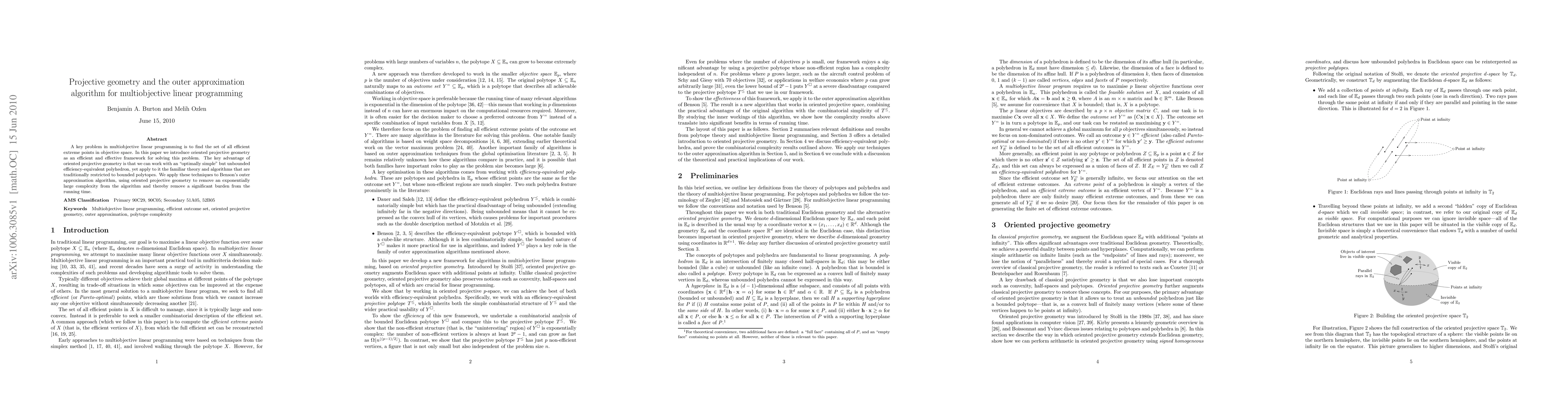 A key problem in multiobjective linear programming is to find the set of all efficient extreme points in objective space. In this paper we introduce oriented projective geometry as an efficient and effective framework for solving this problem. The key advantage of oriented projective geometry is that we can work with an "optimally simple" but unbounded efficiency-equivalent polyhedron, yet apply to it the familiar theory and algorithms that are traditionally restricted to bounded polytopes. We apply these techniques to Benson's outer approximation algorithm, using oriented projective geometry to remove an exponentially large complexity from the algorithm and thereby remove a significant burden from the running time.