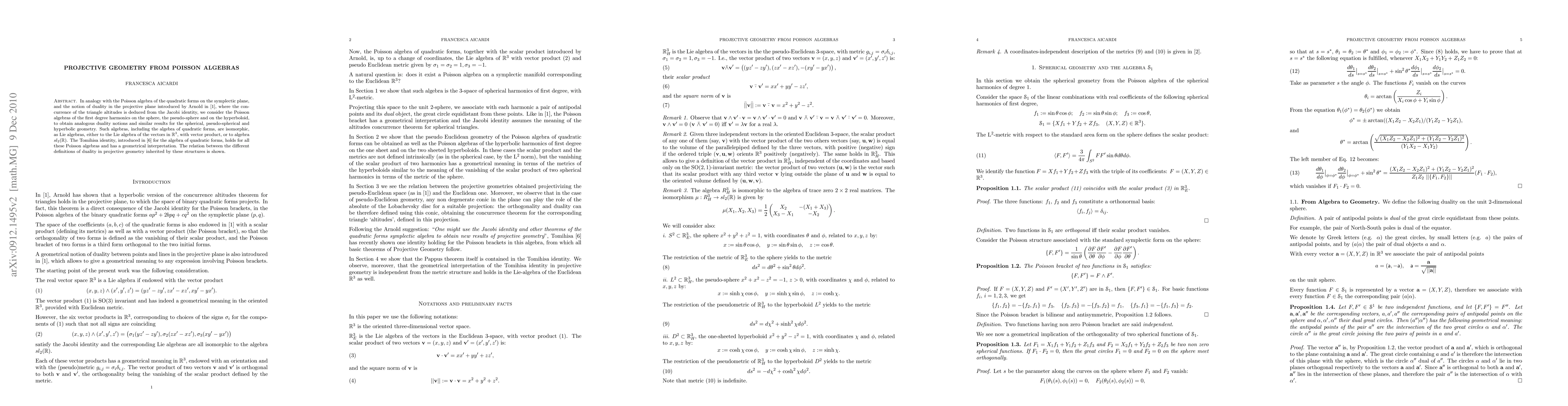 In analogy with the Poisson algebra of the quadratic forms on the symplectic plane, and the notion of duality in the projective plane introduced by Arnold in \cite{Arn}, where the concurrence of the triangle altitudes is deduced from the Jacobi identity, we consider the Poisson algebras of the first degree harmonics on the sphere, the pseudo-sphere and on the hyperboloid, to obtain analogous duality notions and similar results for the spherical, pseudo-spherical and hyperbolic geometry. Such algebras, including the algebra of quadratic forms, are isomorphic, as Lie algebras, either to the Lie algebra of the vectors in $\R^3$, with vector product, or to algebra $sl_2(\R)$. The Tomihisa identity, introduced in \cite{Tom} for the algebra of quadratic forms, holds for all these Poisson algebras and has a geometrical interpretation. The relation between the different definitions of duality in projective geometry inherited by these structures is shown.