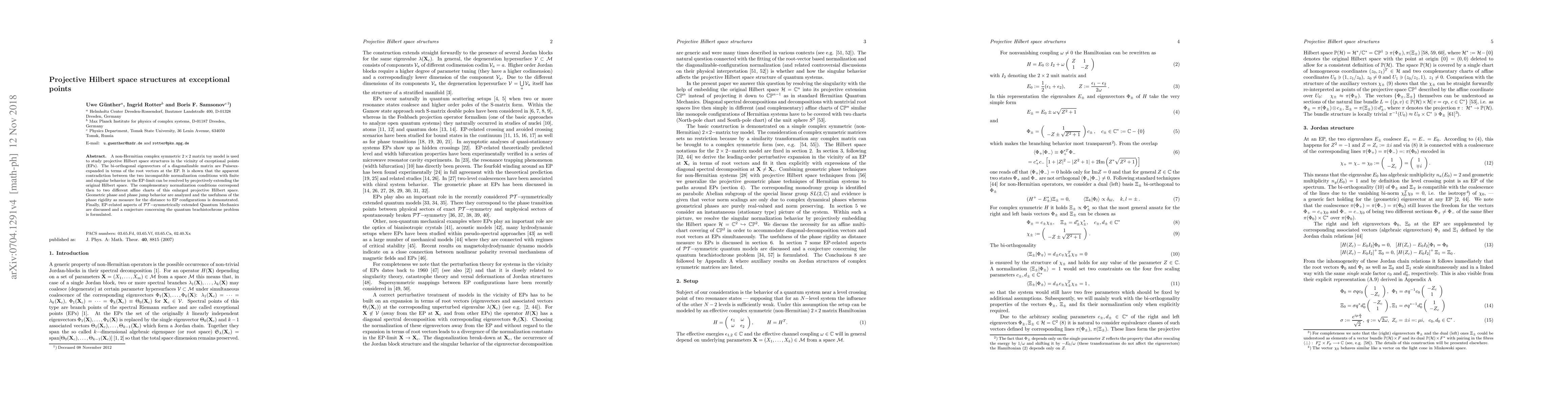 This paper explores projective Hilbert space structures near exceptional points using a non-Hermitian matrix model, resolving normalization contradictions through projective extension. It analyzes geometric phase behavior and discusses PT-symmetric Quantum Mechanics, proposing a conjecture for the quantum brachistochrone problem.