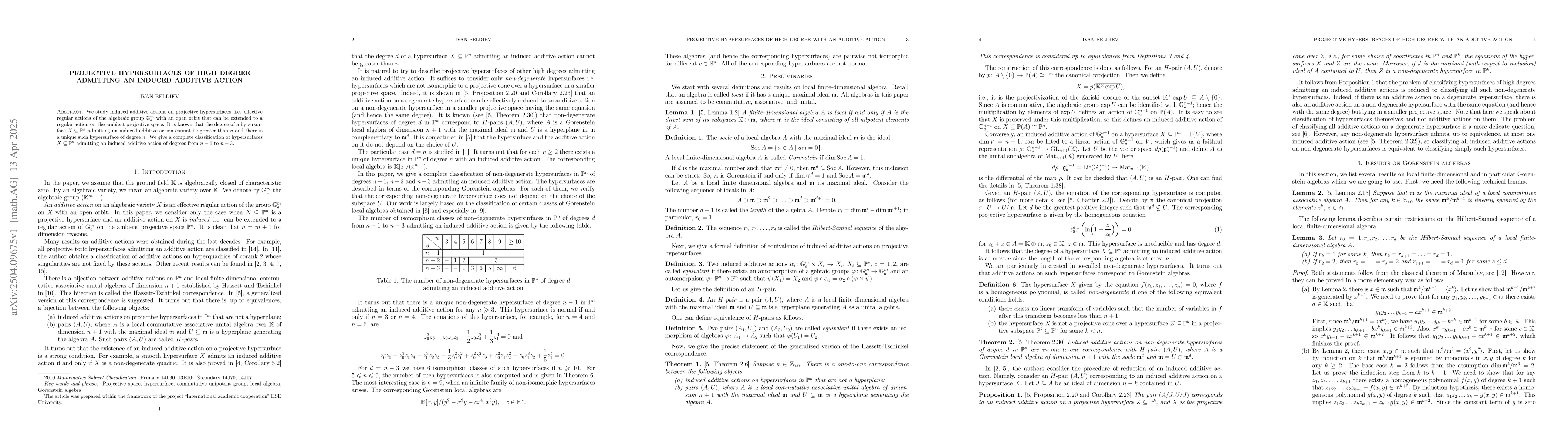 Researchers classify projective hypersurfaces of degrees n-1 to n-3 admitting an induced additive action, providing a unique hypersurface for each degree.