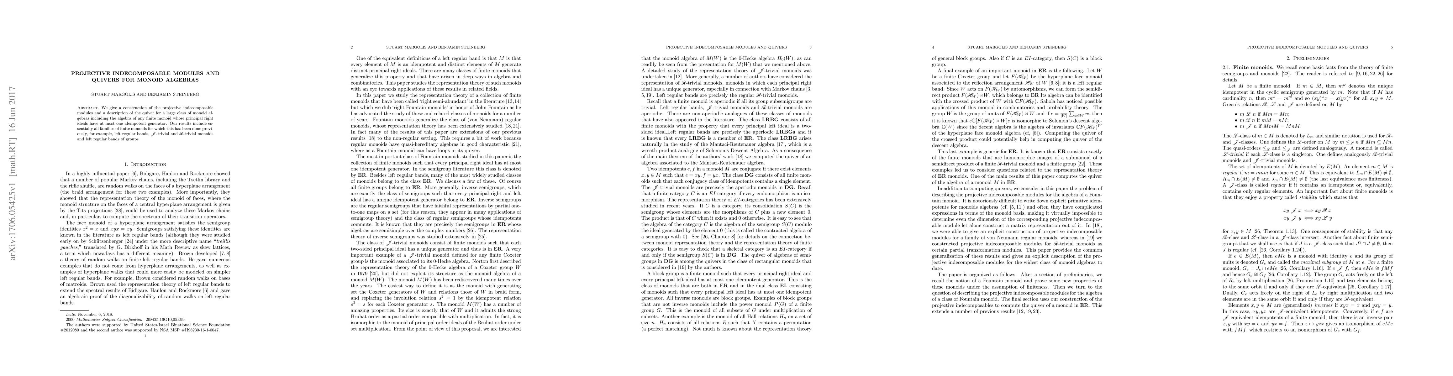 This paper constructs projective indecomposable modules and describes quivers for a broad class of monoid algebras, including those of finite monoids with limited idempotent generators. It covers previously studied families such as left regular bands, $\mathscr J$-trivial, and $\mathscr R$-trivial monoids.