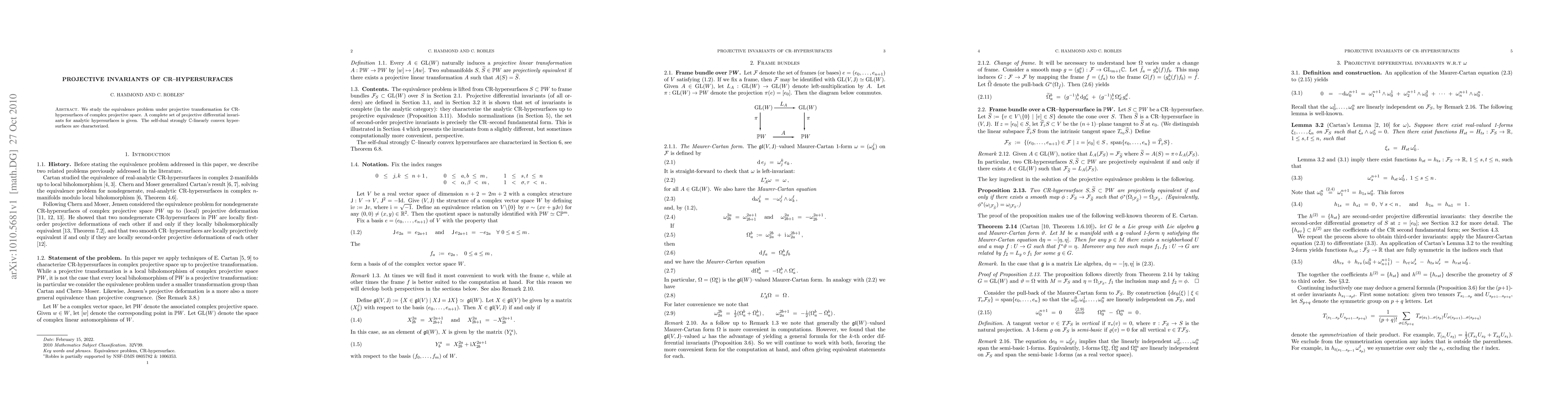 Summary: This paper investigates the projective equivalence of CR-hypersurfaces in complex projective space, presenting a full set of projective differential invariants and characterizing self-dual strongly C-linearly convex hypersurfaces.