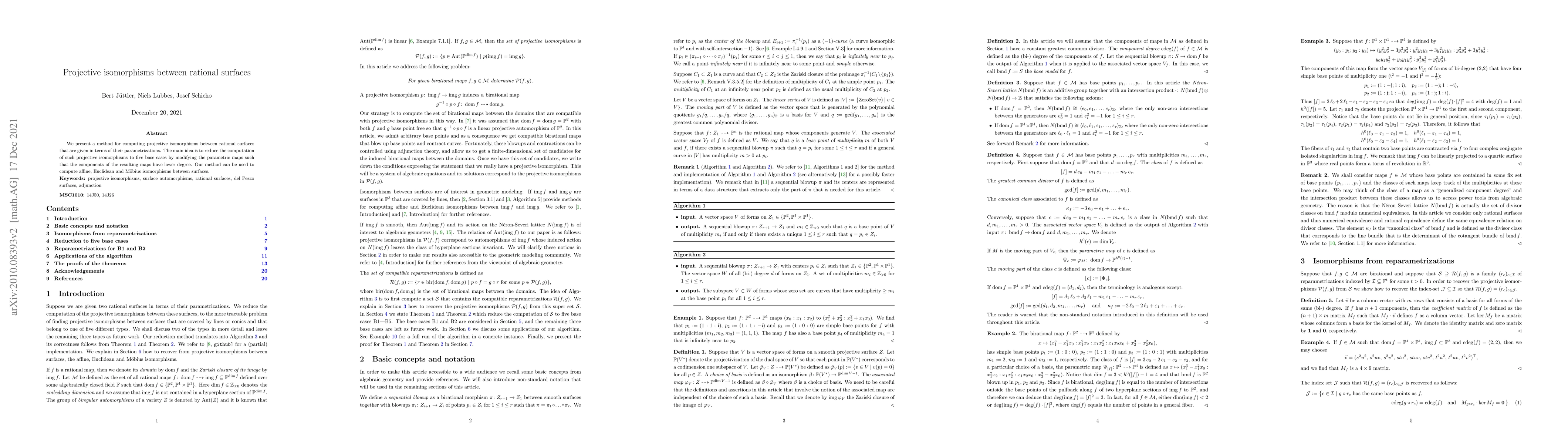 The paper presents a method for computing projective isomorphisms between rational surfaces, reducing the computation to five base cases by modifying parametric maps to lower their degrees. The approach covers affine, Euclidean, and Möbius isomorphisms.