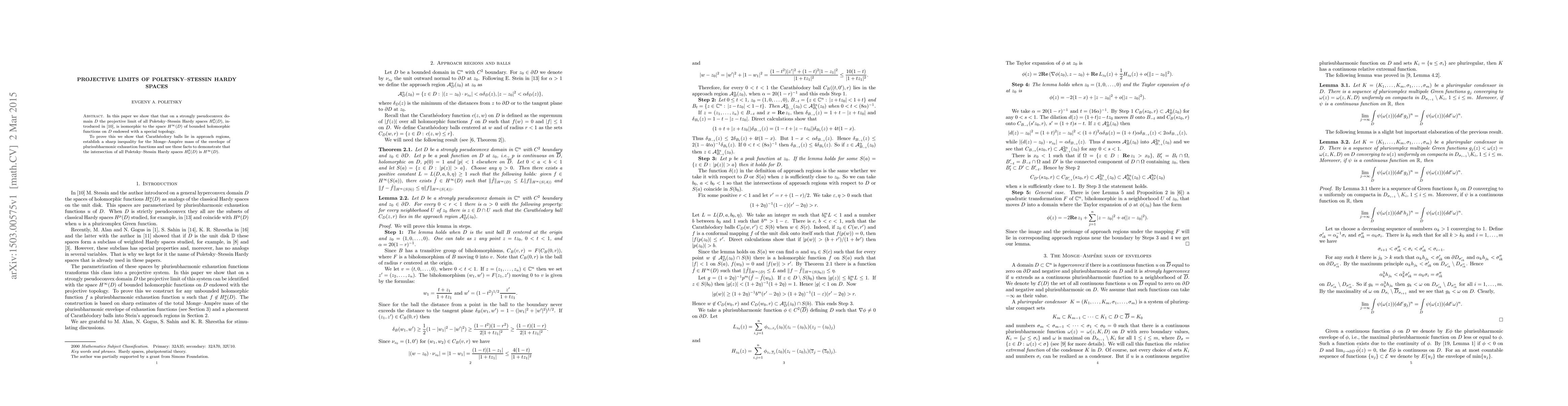In this paper we show that that on a strongly pseudoconvex domain $D$ the projective limit of all Poletsky--Stessin Hardy spaces $H^p_u(D)$, introduced in \cite{PS}, is isomorphic to the space $H^\infty(D)$ of bounded holomorphic functions on $D$ endowed with a special topology. To prove this we show that Carath\'eodory balls lie in approach regions, establish a sharp inequality for the Monge--Amp\'ere mass of the envelope of plurisubharmonic exhaustion functions and use these facts to demonstrate that the intersection of all Poletsky--Stessin Hardy spaces $H^p_u(D)$ is $H^\infty(D)$.