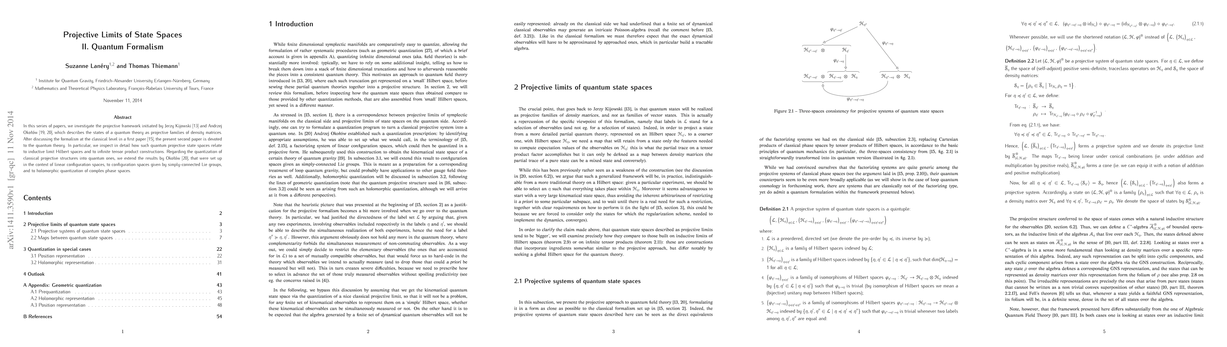 This paper explores the projective framework for quantum states as families of density matrices, extending previous classical discussions. It examines the relationship between quantum projective state spaces and inductive limit Hilbert spaces, as well as infinite tensor product constructions, and generalizes Okoł́ow's quantization results to simply-connected Lie groups and holomorphic quantization.