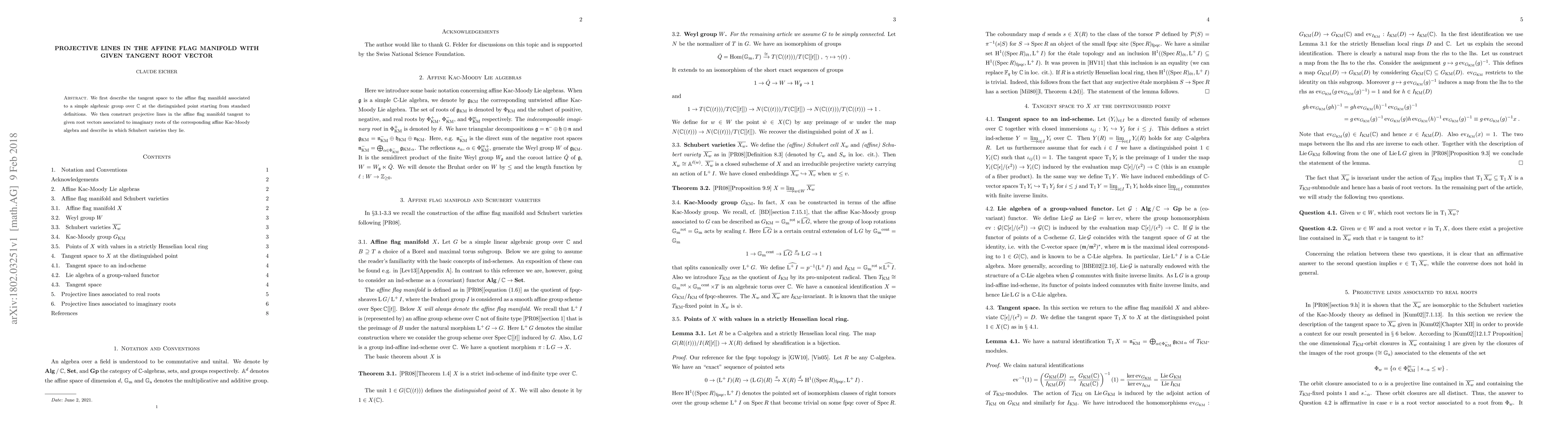 This research paper describes the tangent space of the affine flag manifold at a distinguished point, then constructs projective lines within this manifold tangent to specific root vectors linked to imaginary roots of the corresponding affine Kac-Moody algebra. It identifies the Schubert varieties where these lines reside.