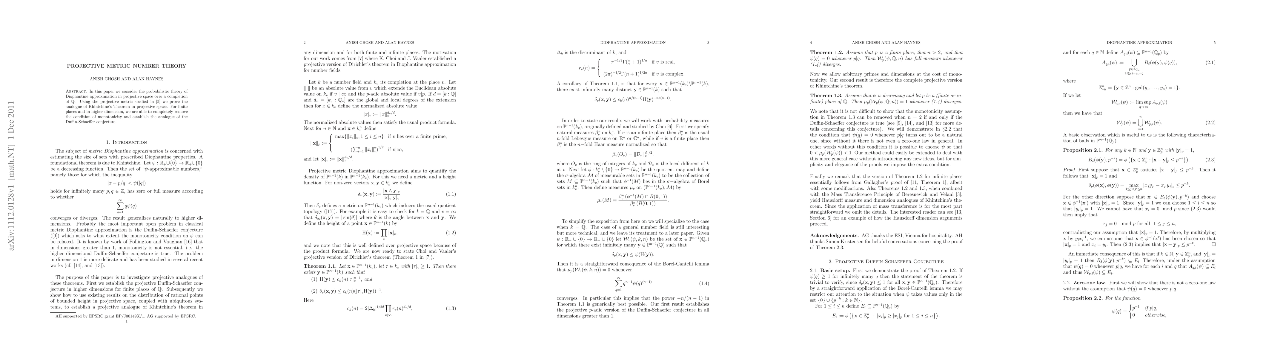 In this paper we consider the probabilistic theory of Diophantine approximation in projective space over a completion of Q. Using the projective metric studied by Bombieri, van der Poorten, and Vaaler we prove the analogue of Khintchine's Theorem in projective space. For finite places and in higher dimension, we are able to completely remove the condition of monotonicity and establish the analogue of the Duffin-Schaeffer conjecture.