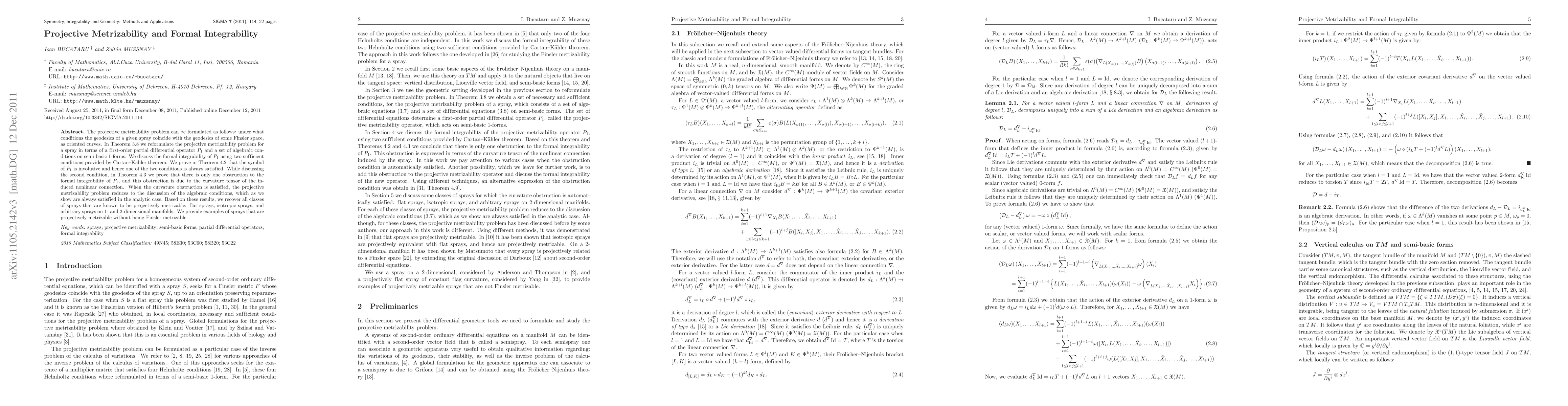 This paper investigates the projective metrizability of sprays by reformulating the problem in terms of a first-order partial differential operator and algebraic conditions. It proves that formal integrability of the operator is always satisfied due to the involutive symbol, and identifies curvature tensor as the main obstruction to formal integrability.