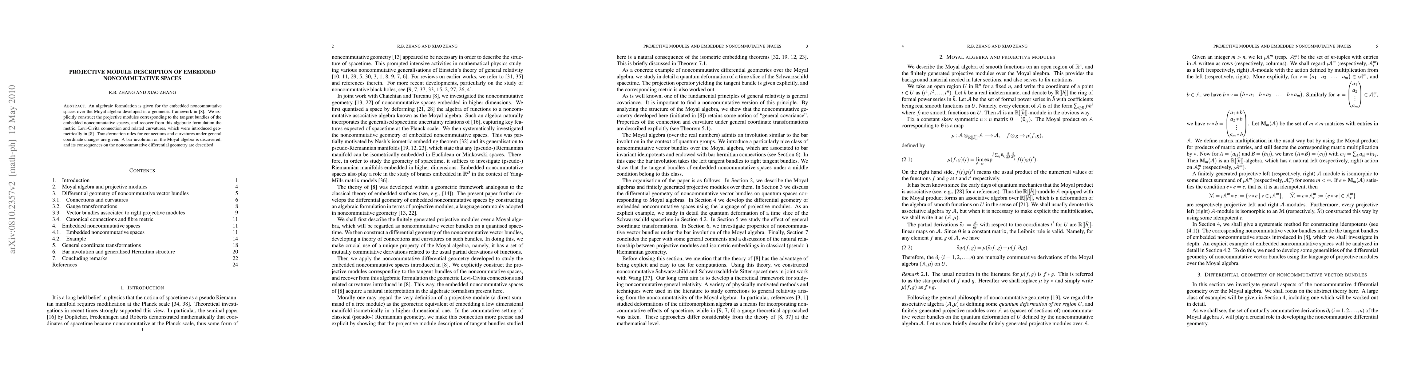 This paper provides an algebraic description of embedded noncommutative spaces over the Moyal algebra, constructing projective modules for tangent bundles and recovering geometric constructs like metric, connection, and curvatures. It also introduces a bar involution on the Moyal algebra and explores its implications for noncommutative differential geometry.