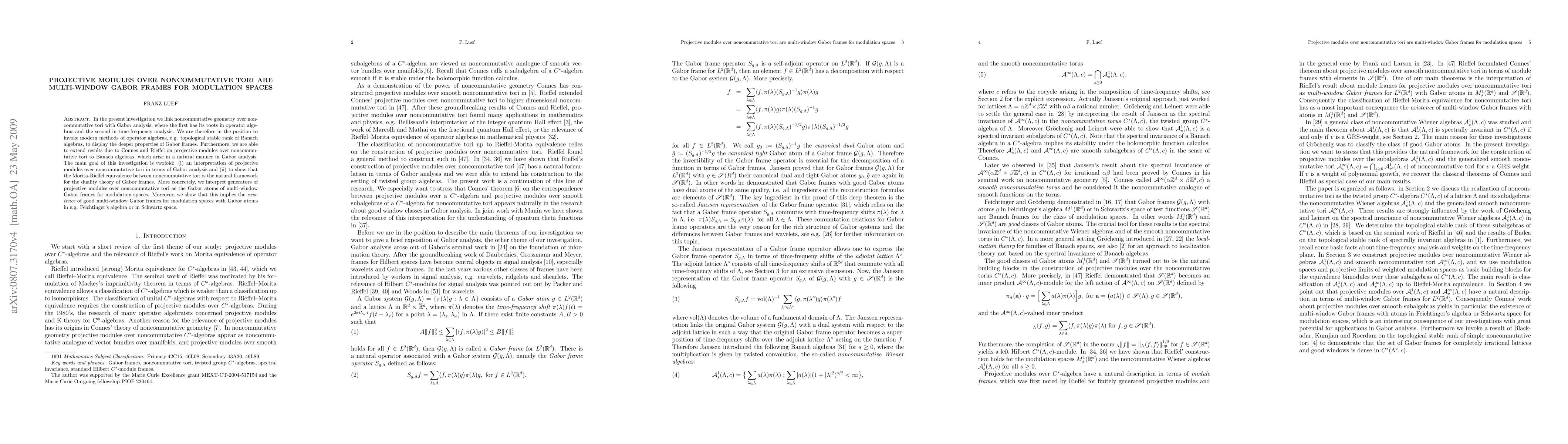 In the present investigation we are linking noncommutative geometry over noncommutative tori with Gabor analysis, where the first has its roots in operator algebras and the second in time-frequency analysis. Therefore we are in the position to invoke modern methods of operator algebras, e.g. topological stable rank of Banach algebras, to exploit the deeper properties of Gabor frames. Furthermore we are able to extend results due to Connes and Rieffel on projective modules over noncommutative tori to Banach algebras, which arise in a natural manner in Gabor analysis. The main goal of this investigation is twofold: (i) an interpretation of projective modules over noncommutative tori in terms of Gabor analysis and (ii) that the Morita-Rieffel equivalence between noncommutative tori is the natural framework for the duality theory of Gabor frames. More concretely, we interpret generators of projective modules over noncommutative tori as the Gabor atoms of multi-window Gabor frames for modulation spaces. Moreover, we show that this implies the {\it existence} of good multi-window Gabor frames for modulation spaces with Gabor atoms in Feichtinger's algebra and in Schwartz space.