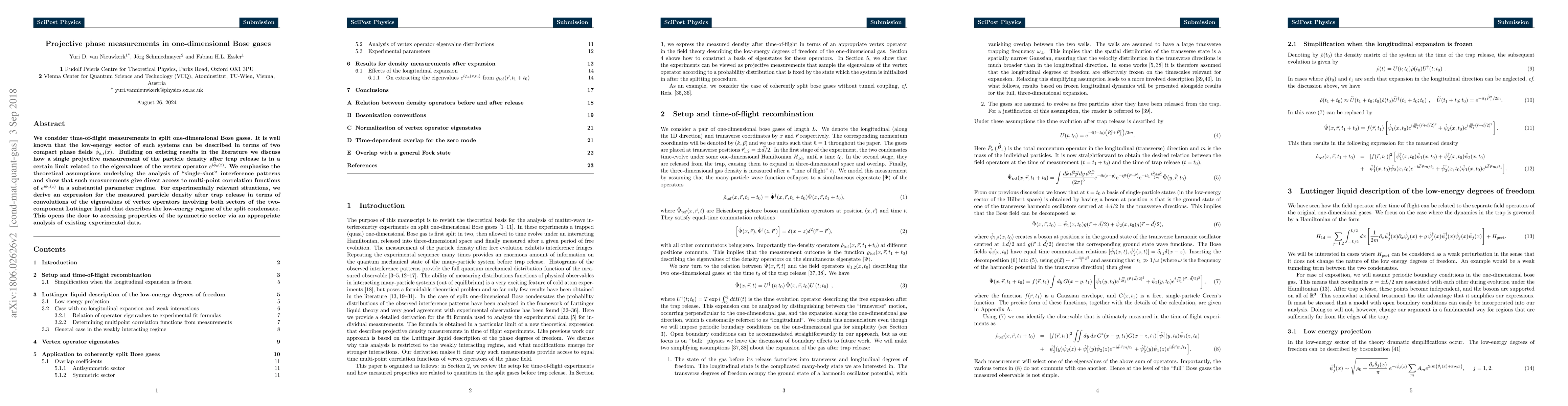 We consider time-of-flight measurements in split one-dimensional Bose gases. It is well known that the low-energy sector of such systems can be described in terms of two compact phase fields $\hat{\phi}_{a,s}(x)$. Building on existing results in the literature we discuss how a single projective measurement of the particle density after trap release is in a certain limit related to the eigenvalues of the vertex operator $e^{i\hat{\phi}_a(x)}$. We emphasize the theoretical assumptions underlying the analysis of "single-shot" interference patterns and show that such measurements give direct access to multi-point correlation functions of $e^{i\hat{\phi}_a(x)}$ in a substantial parameter regime. For experimentally relevant situations, we derive an expression for the measured particle density after trap release in terms of convolutions of the eigenvalues of vertex operators involving both sectors of the two-component Luttinger liquid that describes the low-energy regime of the split condensate. This opens the door to accessing properties of the symmetric sector via an appropriate analysis of existing experimental data.