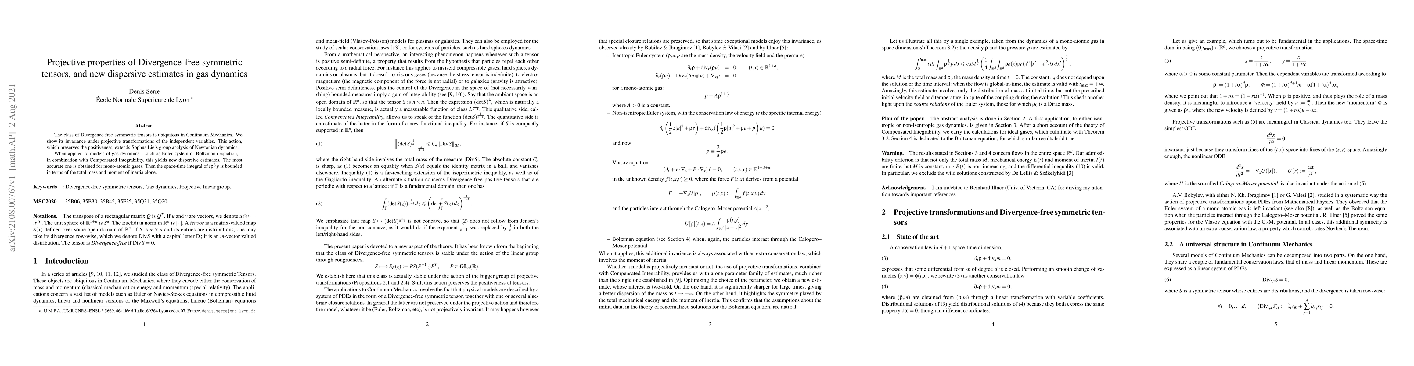 The class of Divergence-free symmetric tensors is ubiquitous in Continuum Mechanics. We show its invariance under projective transformations of the independent variables. This action, which preserves the positiveness, extends Sophus Lie's group analysis of Newtonian dynamics.When applied to models of gas dynamics --~such as Euler system or Boltzmann equation,~-- in combination with Compensated Integrability, this yields new dispersive estimates. The most accurate one is obtained for mono-atomic gases. Then the space-time integral of $t\rho^\frac1d p$ is bounded in terms of the total mass and moment of inertia alone.
