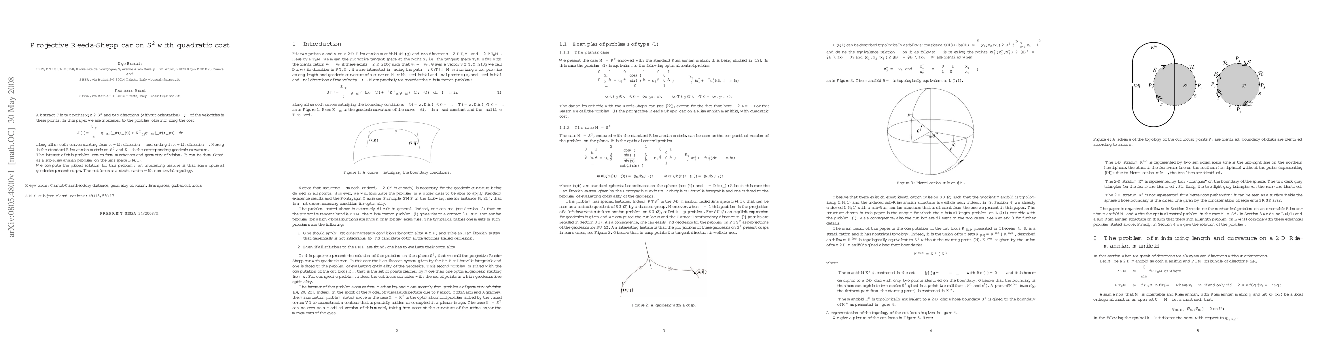 This research analyzes optimal paths on a sphere considering both direction and curvature, revealing complex structures like cusps and layered cut loci. The findings have implications for mechanics and visual perception, modeled through a geometric problem on lens spaces.