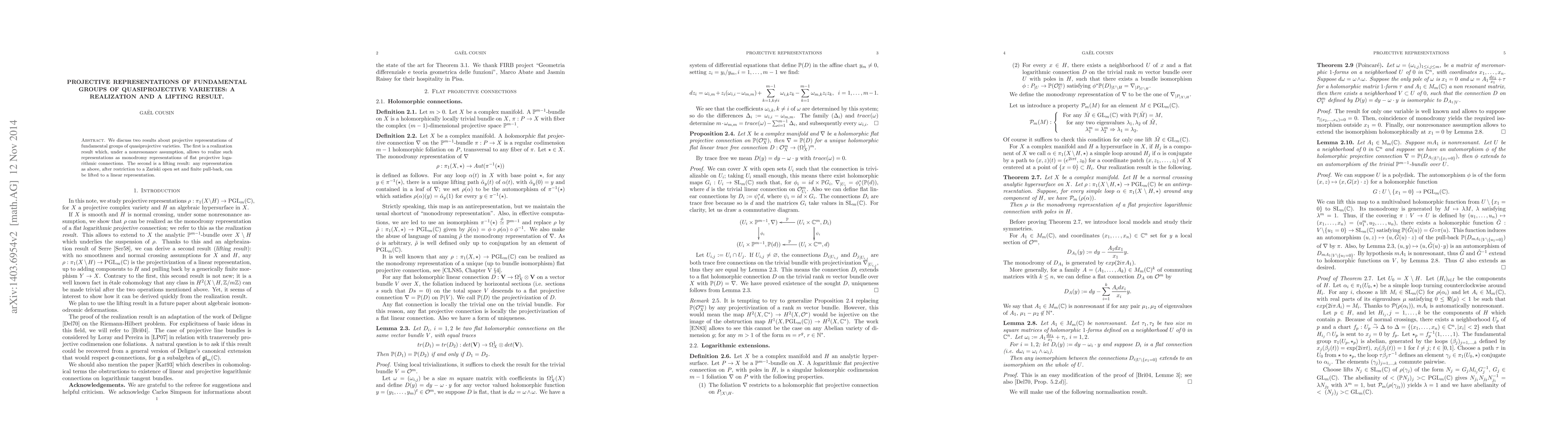 This paper presents two results on projective representations of fundamental groups of quasiprojective varieties. The first result realizes such representations as monodromy representations of flat projective logarithmic connections under nonresonance conditions. The second result shows that any such representation can be lifted to a linear representation after restriction and finite pull-back.